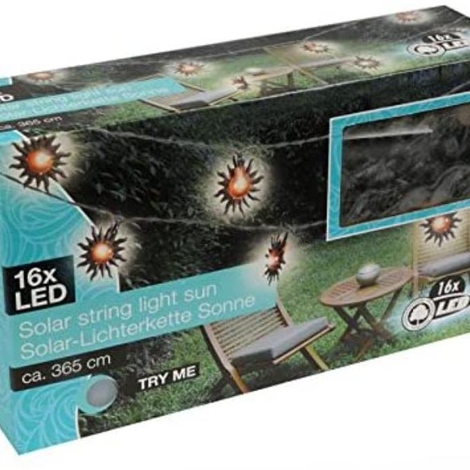 Productbeschrijving: Leuk lichtsnoer met 16 Led Zonnetjes. Deze lichtslang met led lampionnen in de vorm van een design zon is geschikt voor zowel binnen als buiten. Werkt op zonne energie / solar
