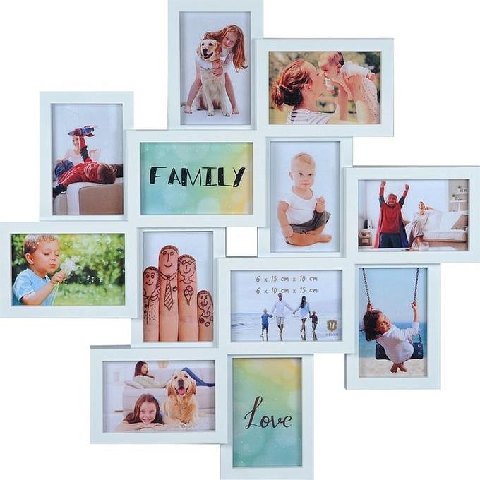 Productbeschrijving: De Henzo Friends Gallery 12 is een eigentijdse fotolijst, die geschikt is voor maar liefst 12 foto's. Deze collagefotolijst bestaat uit twaalf verschillende lijstjes, die speels boven, onder en naast elkaar geplaatst zijn. De randen van sommige lijstjes overlappen elkaar, zodat een diepte-effect ontstaat. De twee kaarten met de tekst 'family' en 'love' kun je naar eigen wens ook blijven gebruiken als speels accent. Landschap- en portretfoto's inlijsten In deze Friends Gallery kun je twaalf foto's van 10×15 centimeter inlijsten. Je kunt er zes horizontaal en zes verticaal inlijsten, dus in deze fotolijst passen zowel landschap- als portretfoto's. De lijst is vervaardigd van kunststof en wordt geleverd in de kleur wit. Twee van de lijstjes zijn gevuld met een kaart met tekst.