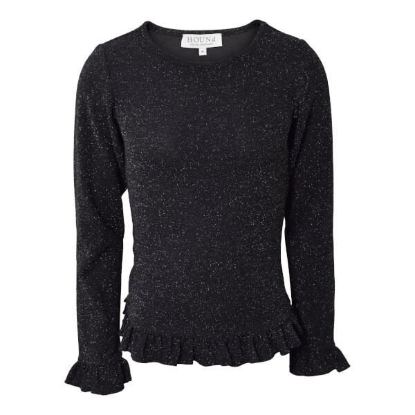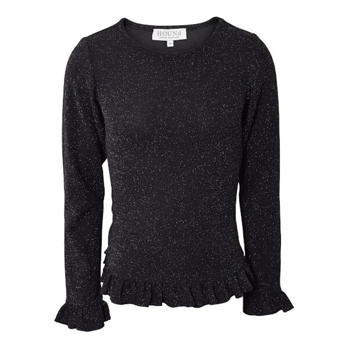 Productbeschrijving: Prachtige zwarte blouse met glitter van Hound. De blouse heeft fijne ruches aan de onderkant en bij de mouwen.