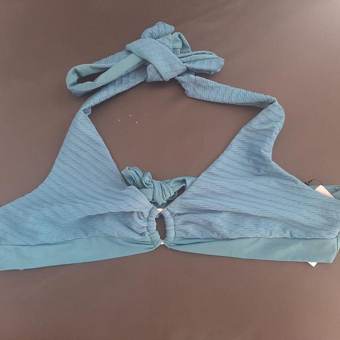 Productbeschrijving: Icon By Cyell Bikini topje Moonrise Teal in maat 38B heeft striksluitingen bij de nek en rug en de bikini heeft een rose gouden detail tussen de boezem