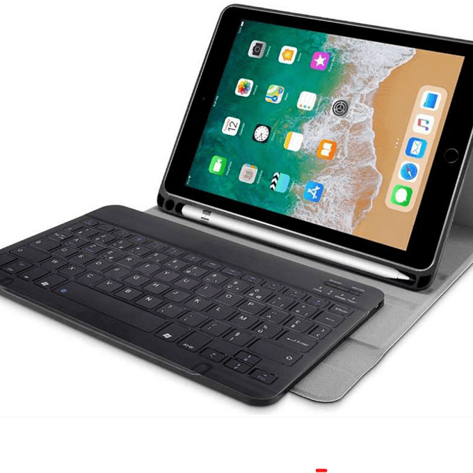 Productbeschrijving: Deze fraaie keyboard case voor de iPad 9.7 (model 2018 en 2017) beschermt uw tablet niet alleen, maar voorziet ook in een handige draadloos toetsenbord dat u met de iPad kunt koppelen. Vervolgens kunt u comfortabel en snel op het fysieke toetsenbord werken in plaats van het toch wat minder handige digitale toetsenbord op het scherm. Deze iPad 9.7 toetsenbord hoes is uitgerust met een AZERTY indeling. Het keyboard koppelt u eenvoudig en snel met uw tablet via Bluetooth. Het toetsenbord hoeft alleen de eerste keer gekoppeld te worden: elke volgende keer verloopt de koppeling automatisch zodra u het toetsenbord aan zet. Het toetsenbord beschikt over een eigen accu welke u via de meegeleverde kabel kunt opladen. Dit hoeft in praktijk slechts ééns in de 1-2 maanden, afhankelijk van uw gebruik.