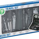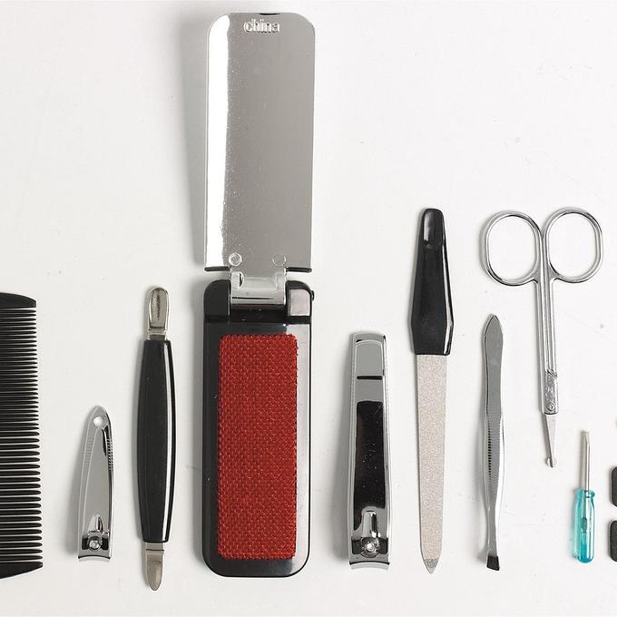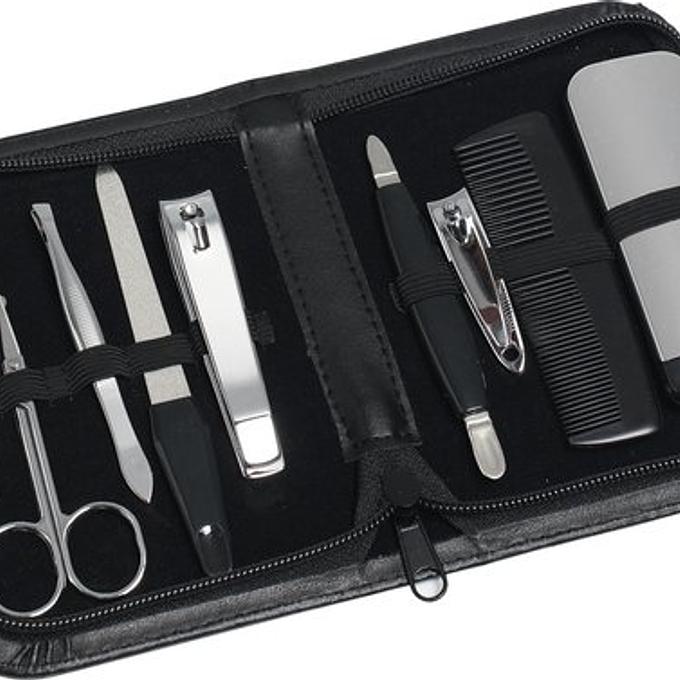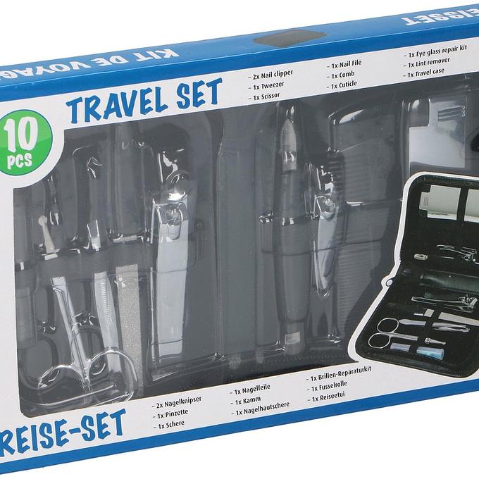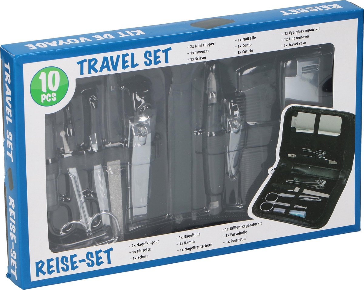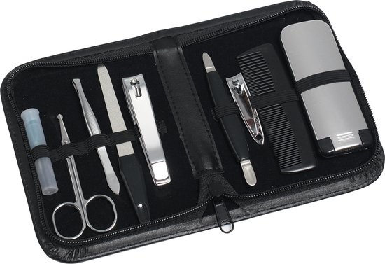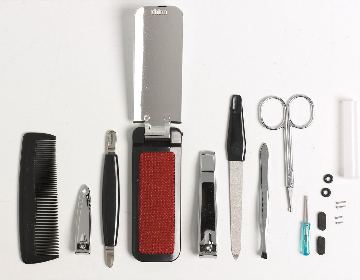 Productbeschrijving: Manicure reisset in etui (9 delig) Inhoud van deze set: 1x kam, 1x ronde spiegel, 2x nagelknipper, 2x multitool (3-in-1), 1x nagelborstel, 1x nagelvijl
