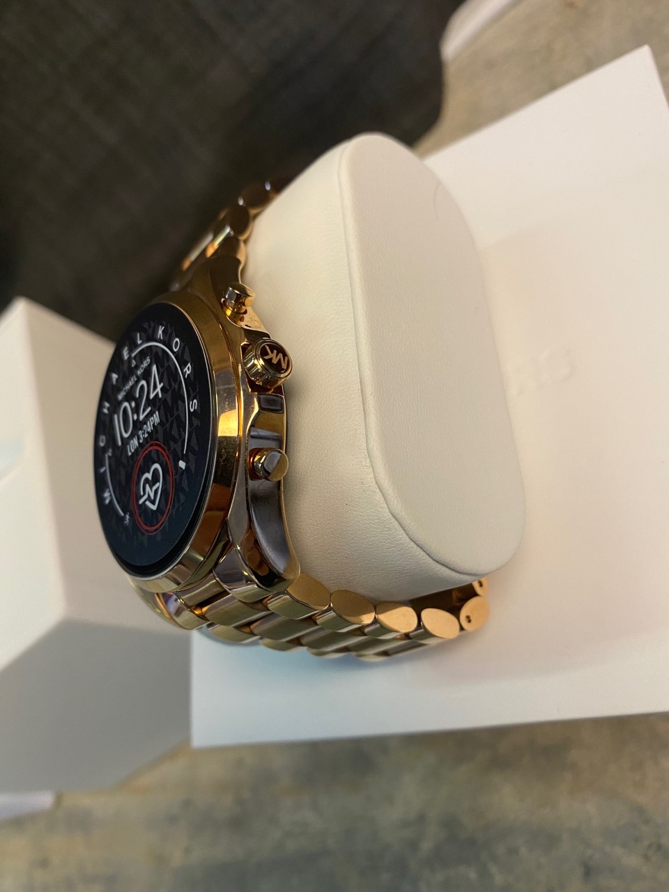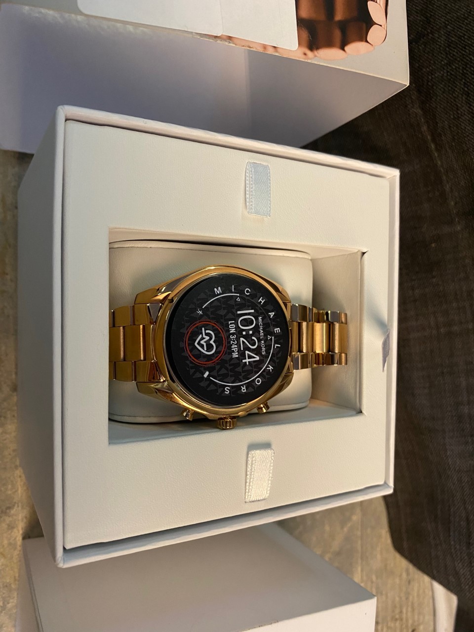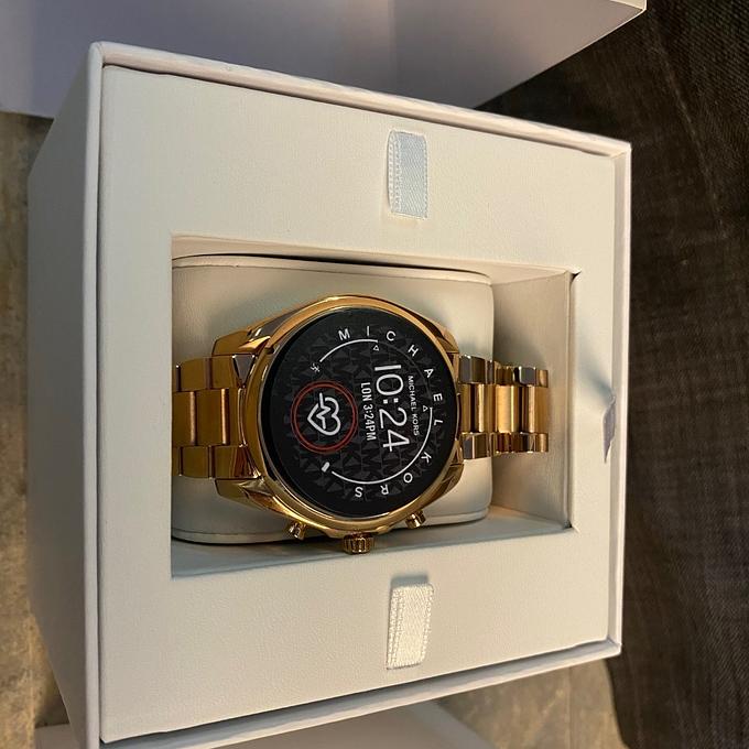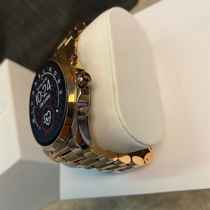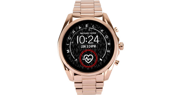 Omschrijving: De Michael Kors Access Bradshaw Gen 5 is de slimme variant van de analoge Bradshaw. De klassieke vormgeving van de kast en het bandje staan in mooi contrast met het scherpe en kleurrijke AMOLED touchscreen. Het horloge heeft een speaker en microfoon waardoor je er ook mee belt. Je telefoon moet wel in de buurt zijn. Met de Bradshaw ben je in een letterlijke handomdraai op de hoogte van meldingen van jouw sociale media kanalen en WhatsApp. Ook ontvang je notificaties van agendapunten. Verder houd je jouw gezondheid in de gaten, want het horloge meet onder meer je hartslag en calorieverbranding. Ook krijg je inzicht in je conditie. Dat doet het horloge met een VO2 max meting, die de maximale zuurstofopname van je bloed meet.