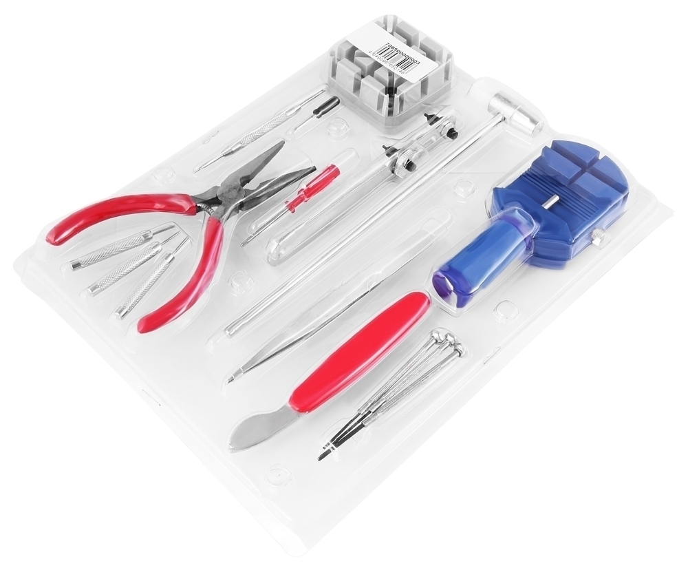 Onderdelen: 3 x magnetische precisie gleuf schroevendraaier, 1 x Link Remover, 1 x pinverwijderaar, 1 x horlogekast houder, 1 x metaal en kunststof hamer, 2 x Phillips schroevendraaier, 1 x mes, 1 x verstelbare behuizing opener, 1 x roestvrij stalen pincet, 3 x pin punch en een 1 x Punttang met zijkniptang.
