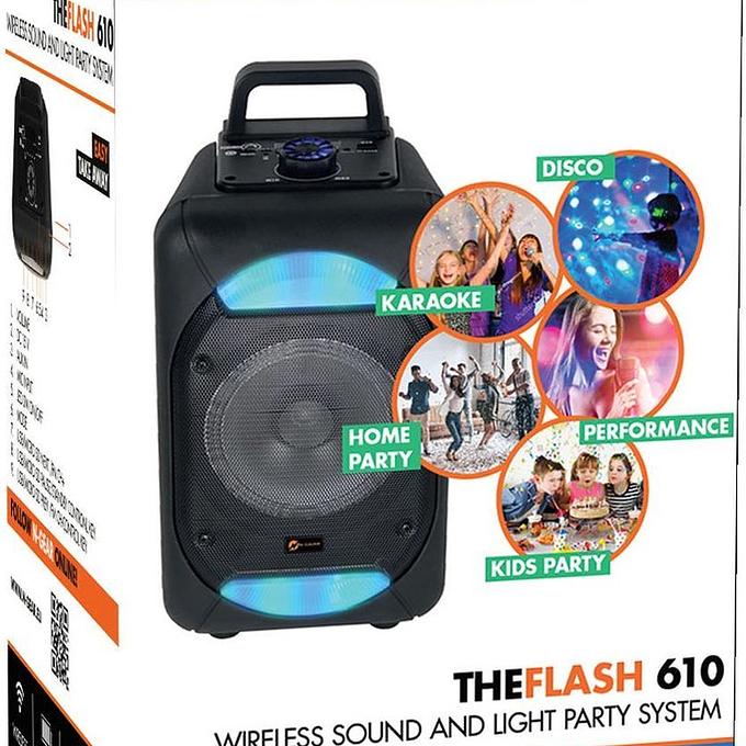 Productbeschrijving: De nieuwe N-Gear FLASH 610 party speaker neem je mee naar elk feestje dankzij het telescopisch handvat en wielen. De FLASH 610 beschikt over een vermogen van 100 Watt met een 6"inch (15cm) woofer, met een speeltijd tot 6 uur! Standaard met te gekke echo uit de microfoon! Gebruikshandleiding Verbind je telefoon en/of tablet via Bluetooth en zing mee met je favoriete liedjes via de bijgeleverde microfoon. Met de ingebouwde disco verlichting in de woofer maak je je feest helemaal af. Er kan een SD-Kaart, een USB en een AUX-apparaat op worden aangesloten!
