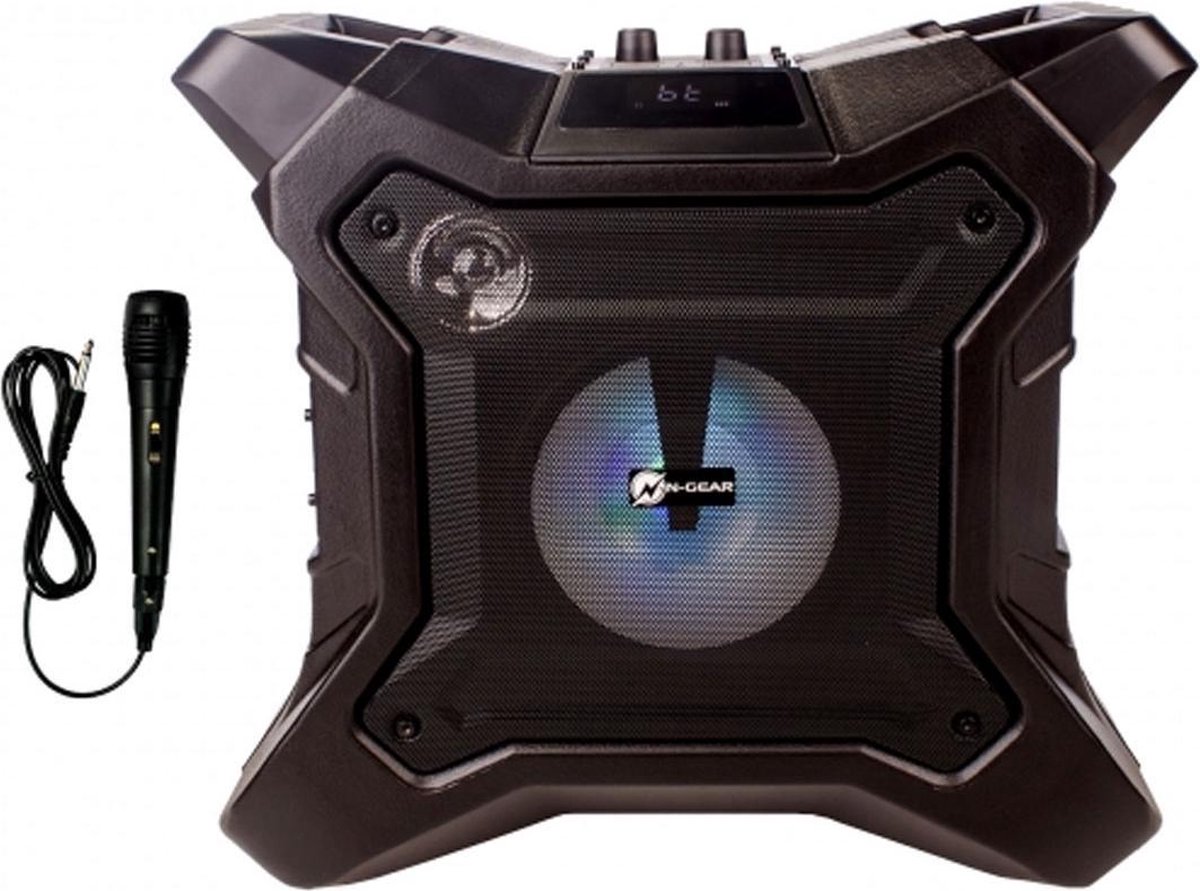 Productbeschrijving: Met de robuuste N-Gear ' The X' bouw je waar je maar wilt een feestje met je favoriete muziek. De speaker is waterdicht (IPX5) en is daarom ideaal om buiten te gebruiken, bijvoorbeeld op de bouw. Met de lichteffecten en meegeleverde microfoon maak je er helemaal jouw show van. Op gemiddeld volume gaat de batterij wel tot 8,5 uur mee en binnen 5 uur is hij weer volledig opgeladen.