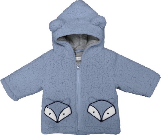 Productbeschrijving: Lichtblauw teddy jasje voor Baby jongens. Het jasje is voorzien van een capuchon en een ritssluiting. Op het voorpand zitten twee steekzakjes in de vorm van vosjes.