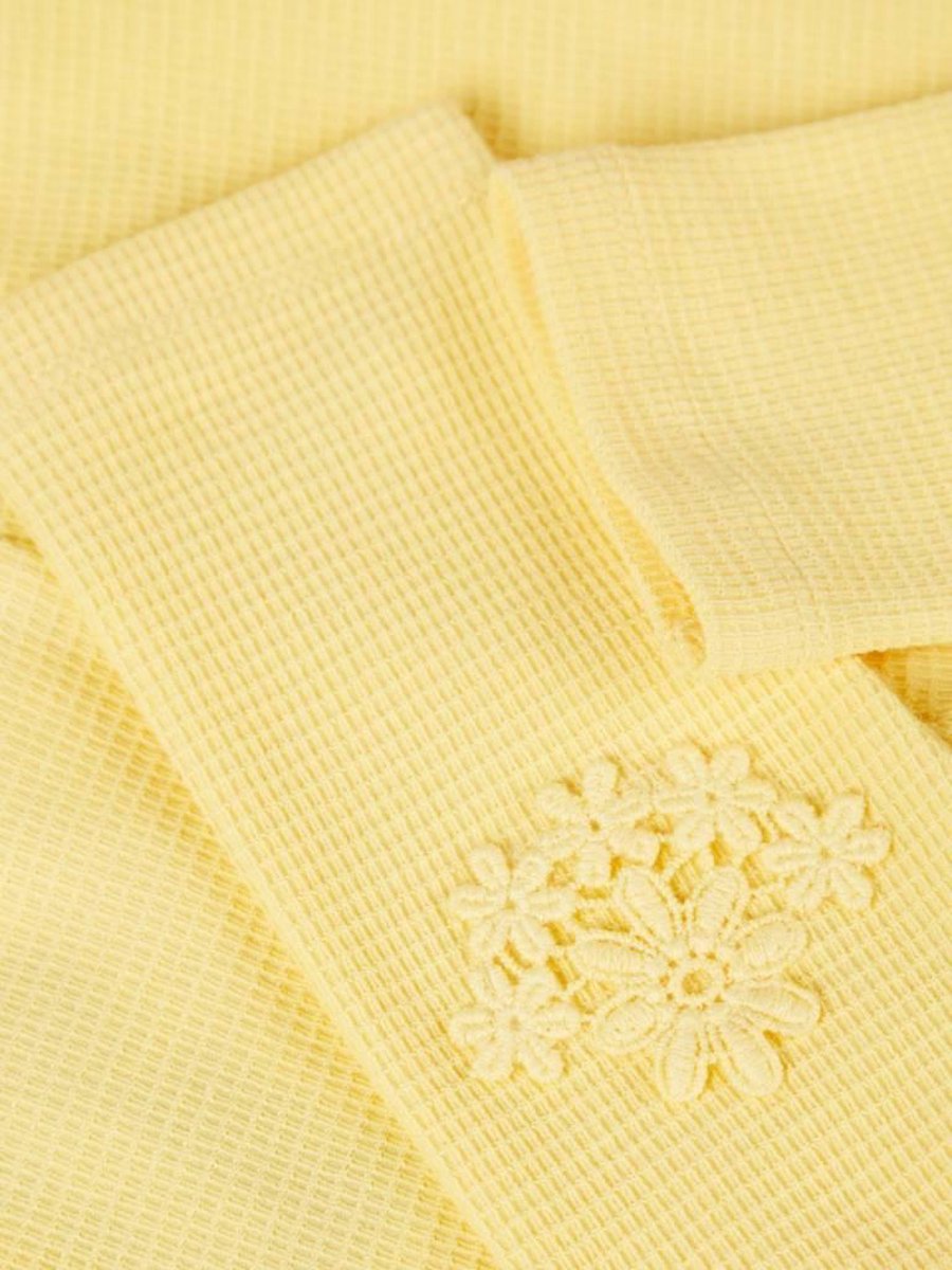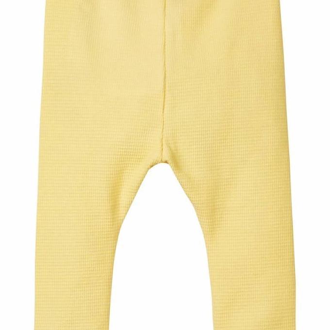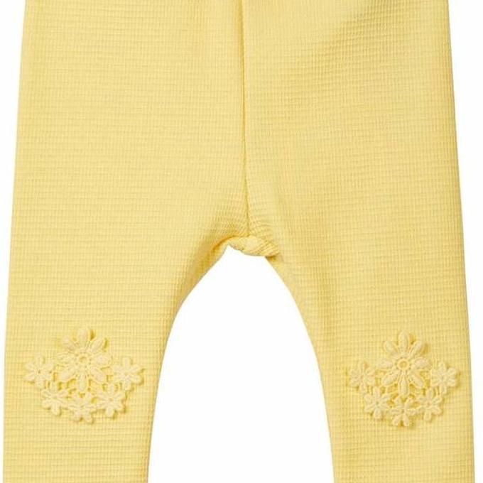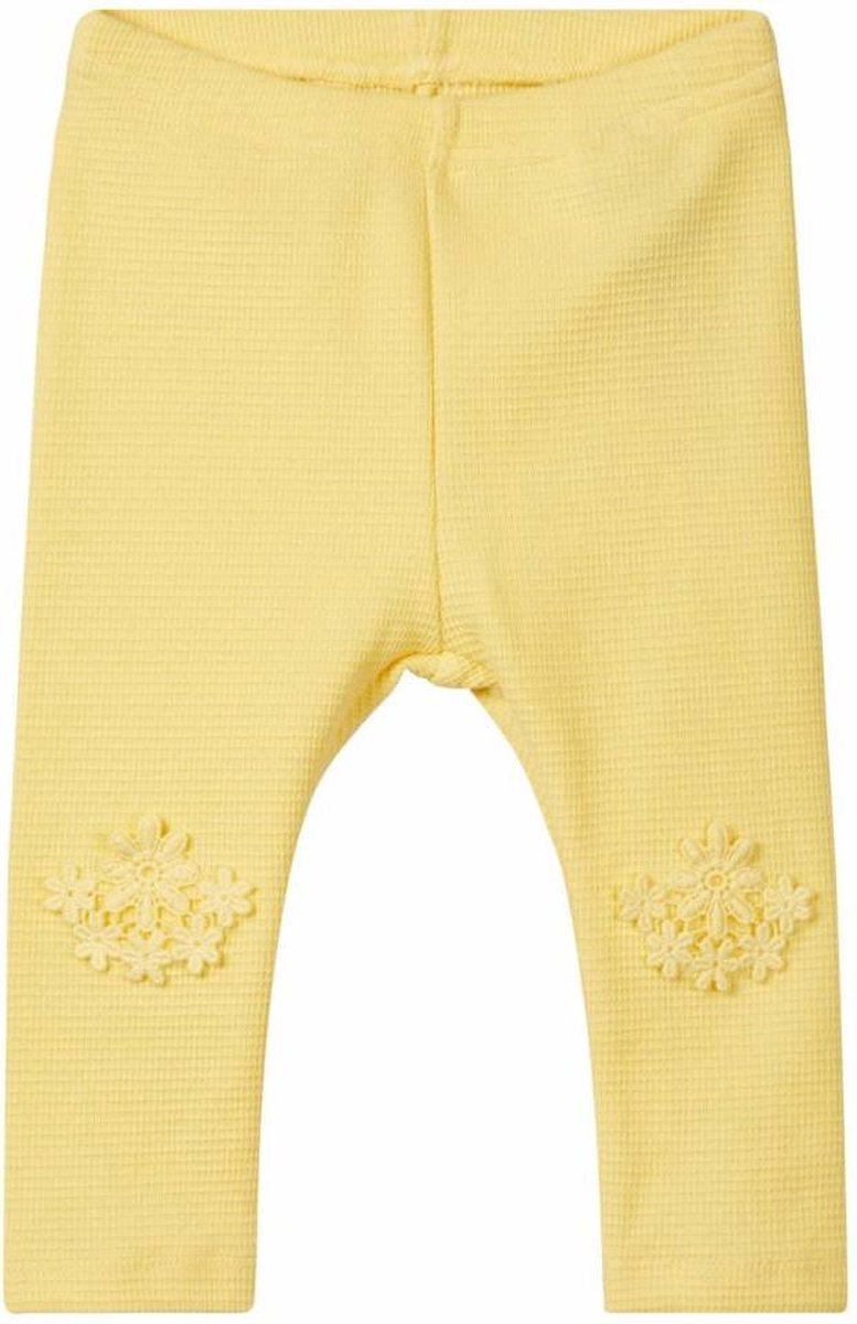 Productbeschrijving: Meisjes gele legging BONNY van het kinderkleding merk Name-it. Een mooie effen gele zomer legging in een geruite stof met 2 op vast genaaide bloemen. De legging is vervaardigd uit Bio katoen.