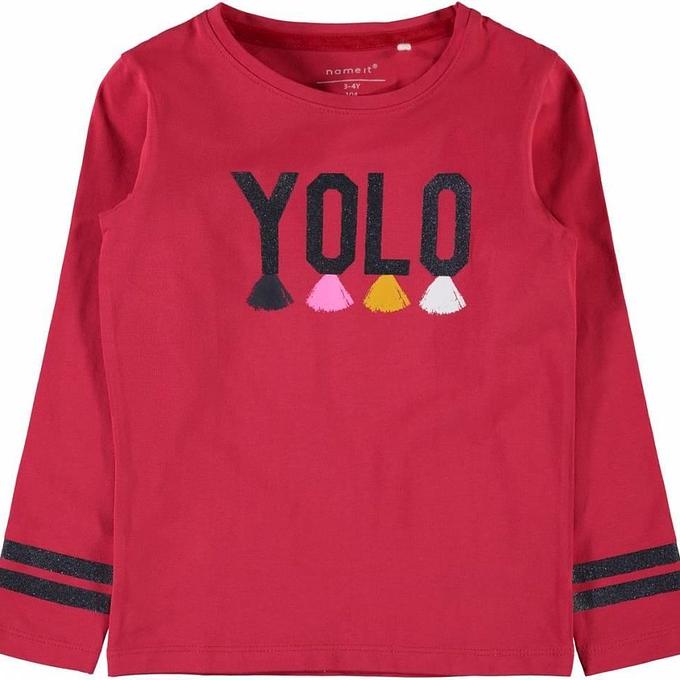 Productbeschrijving: Dit is een fel rode t-shirt voorzien van een lange mouw en een ronde hals. De shirt heeft een donker baluw opschrift : YOLO met onder elke letter een gedrukt pluimpje in 4 verschillende kleuren. Op de mouwen zijn 2 strepen in dezelfde kleur als het opschrift.