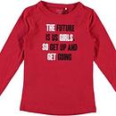Productbeschrijving: Stoer meisjes t-shirt van name it. Het rode t-shirt heeft lange mouwen en een ronde hals. Op de voorkant staat de tekst 'The future is us girls, so get up and get going'.