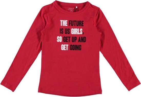 Productbeschrijving: Stoer meisjes t-shirt van name it. Het rode t-shirt heeft lange mouwen en een ronde hals. Op de voorkant staat de tekst 'The future is us girls, so get up and get going'.