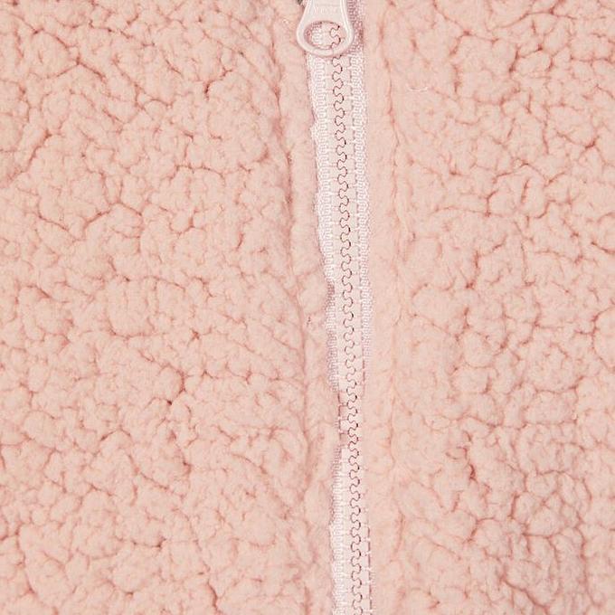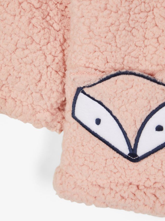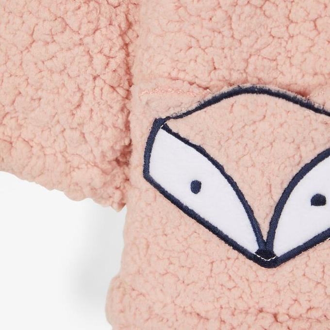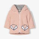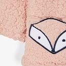Productbeschrijving: Lichtroze teddy jasje voor Baby meiden. Het jasje is voorzien van een capuchon en een ritssluiting. Op het voorpand zitten twee steekzakjes in de vorm van vosjes.