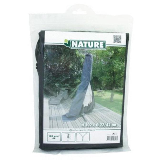 Productbeschrijving: Als je je spullen goed onderhoudt, kan je langer van ze genieten. Met de Beschermhoes van Nature bescherm je je parasol tegen diverse weeromstandigheden en stof. Zo hoef je niet elke keer je parasol in de schuur op te bergen, maar kan deze gewoon buiten blijven staan. Geschikt voor een rechte parasol. De hoes is gemaakt van UV-bestendig polyethyleen. De dichtheid van de hoes is 100 g/m2, een zeer stevige hoes dus waar je lang van kunt genieten. Onderaan de hoes vind je ogen, een nylonkoord en een ritssluiting zodat deze goed op zijn plek blijft zitten.