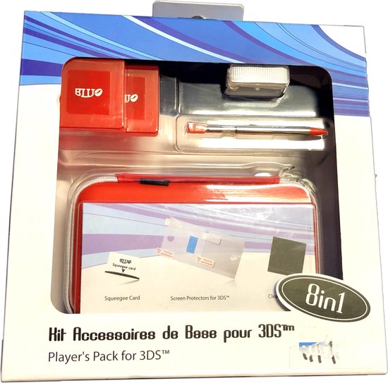 Voorzien van: 1x Uitrekbare Touch pen 1x 3DS Rode Case 2x SD Game bescherming 1x Koord Bevestiging voor de Case 1x Microvezel schoonmaak doekje 1x Scherm Bescherming 1x Queggee Card om vuil uit de DS te halen