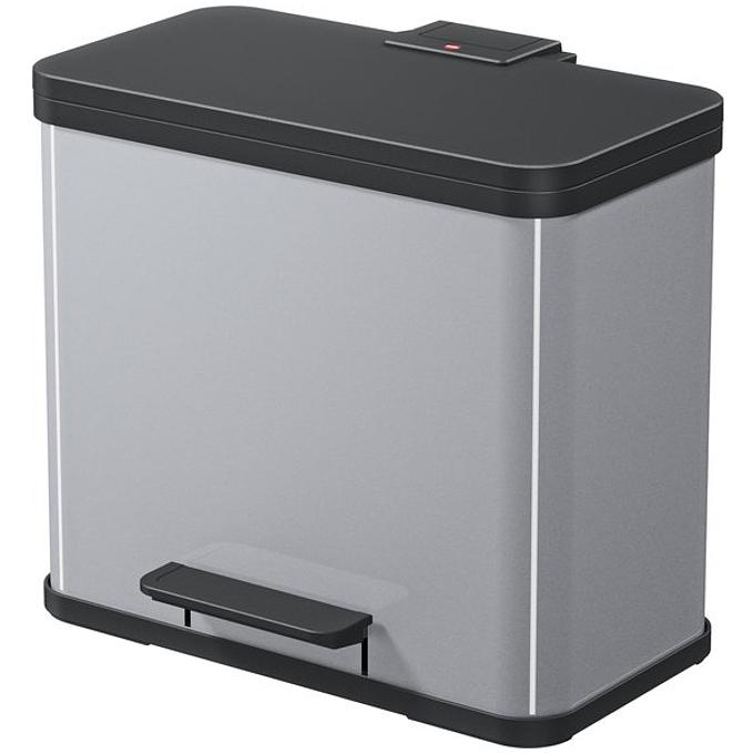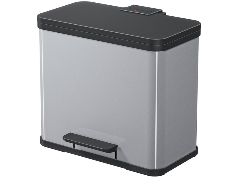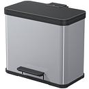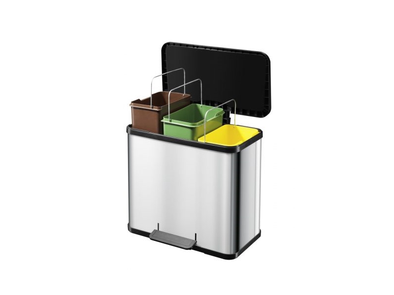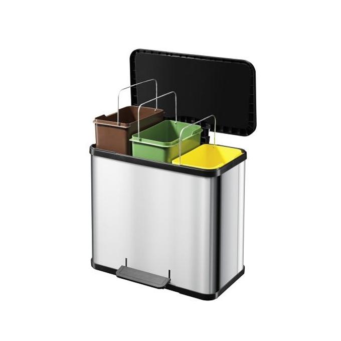 Productbeschrijving: Rechthoekige pedaalemmer met zwart kunststof gedempt sluitend deksel en drie uitneembare kunststof binnenemmers voor afvalscheiding.