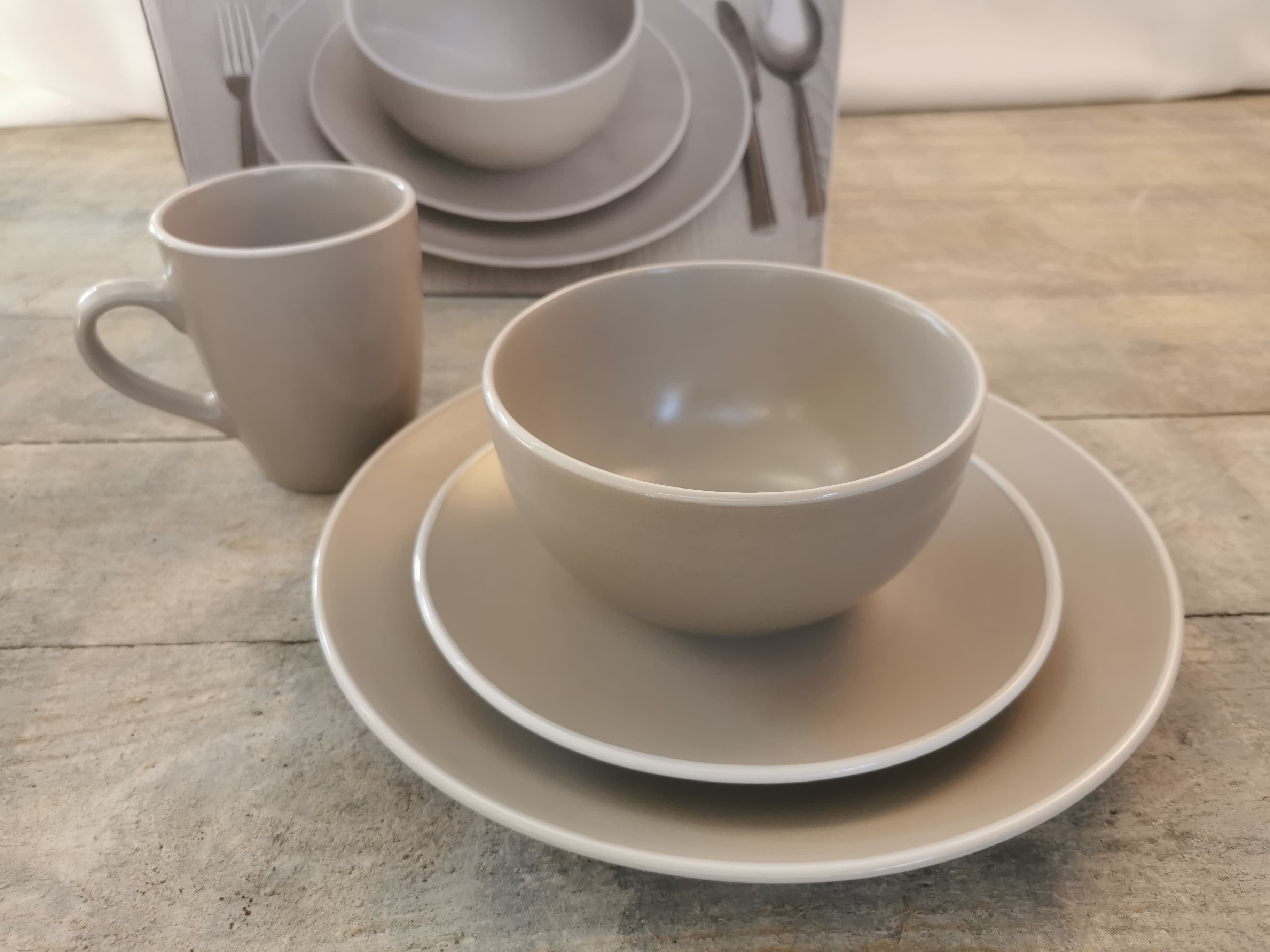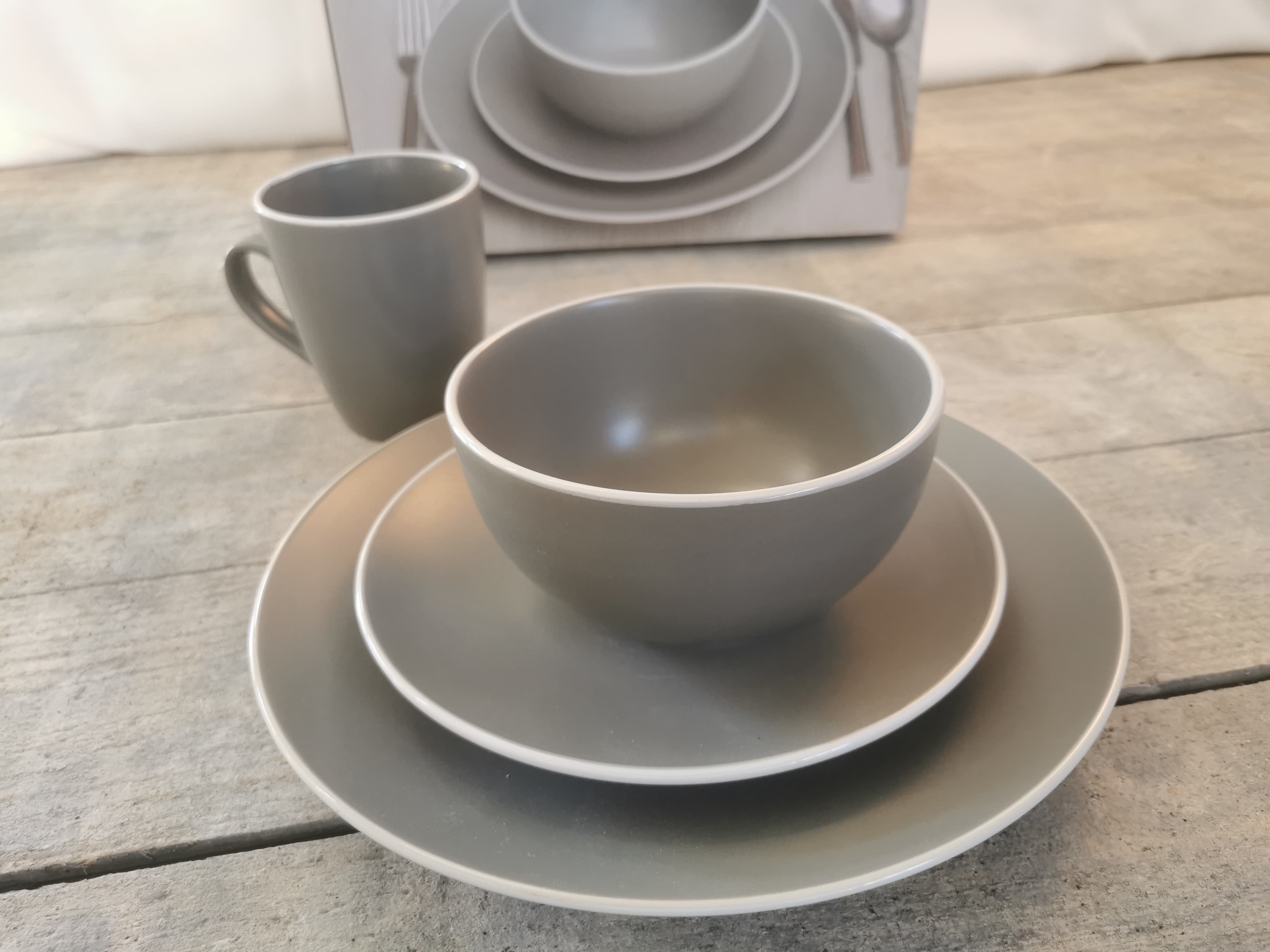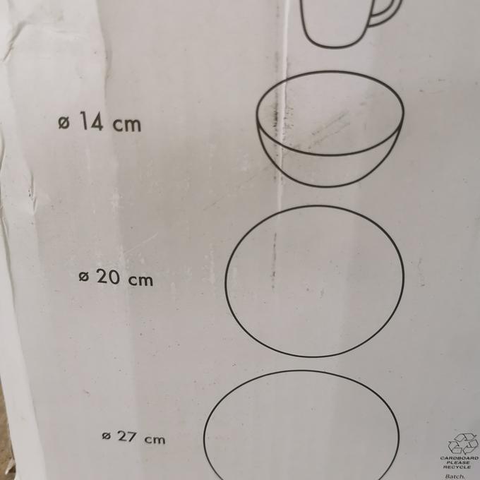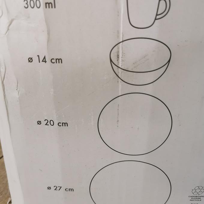 Onderdelen: 4 Dinerborden, 3 ontbijtborden, 4 kommen en 4 mokken