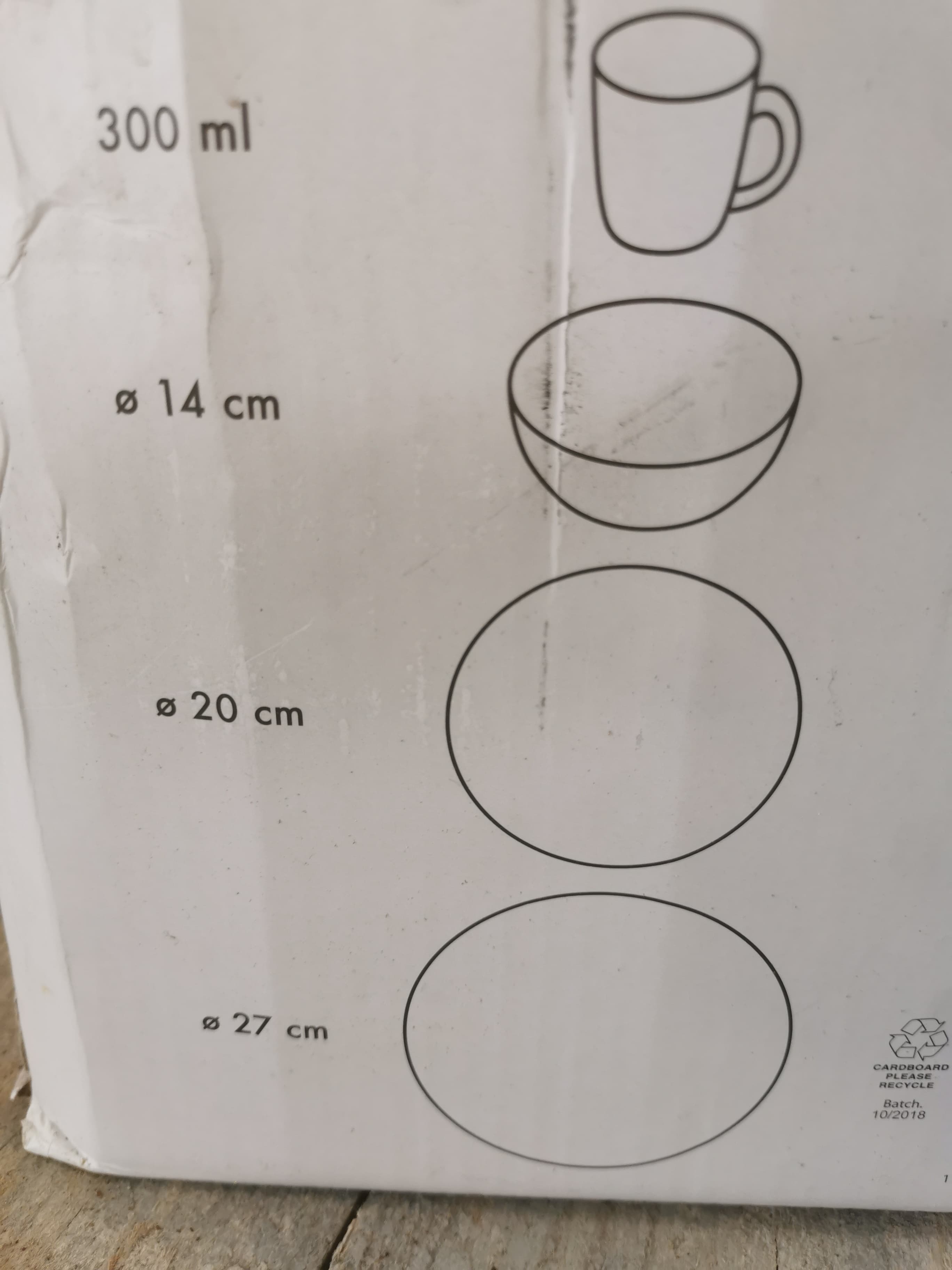 Onderdelen: 4 Dinerborden, 3 ontbijtborden, 4 kommen en 4 mokken