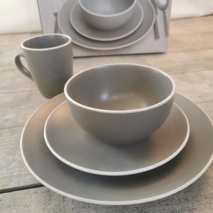 Productbeschrijving: Met deze stijlvolle 15-delige serviesset Oslo (lichtgrijs) ben je klaar voor iedere maaltijd. De set bestaat uit: 4 dinerborden, 3 ontbijtborden, 4 kommen en 4 mokken in het lichtgrijs en is daarmee geschikt voor 4 personen.