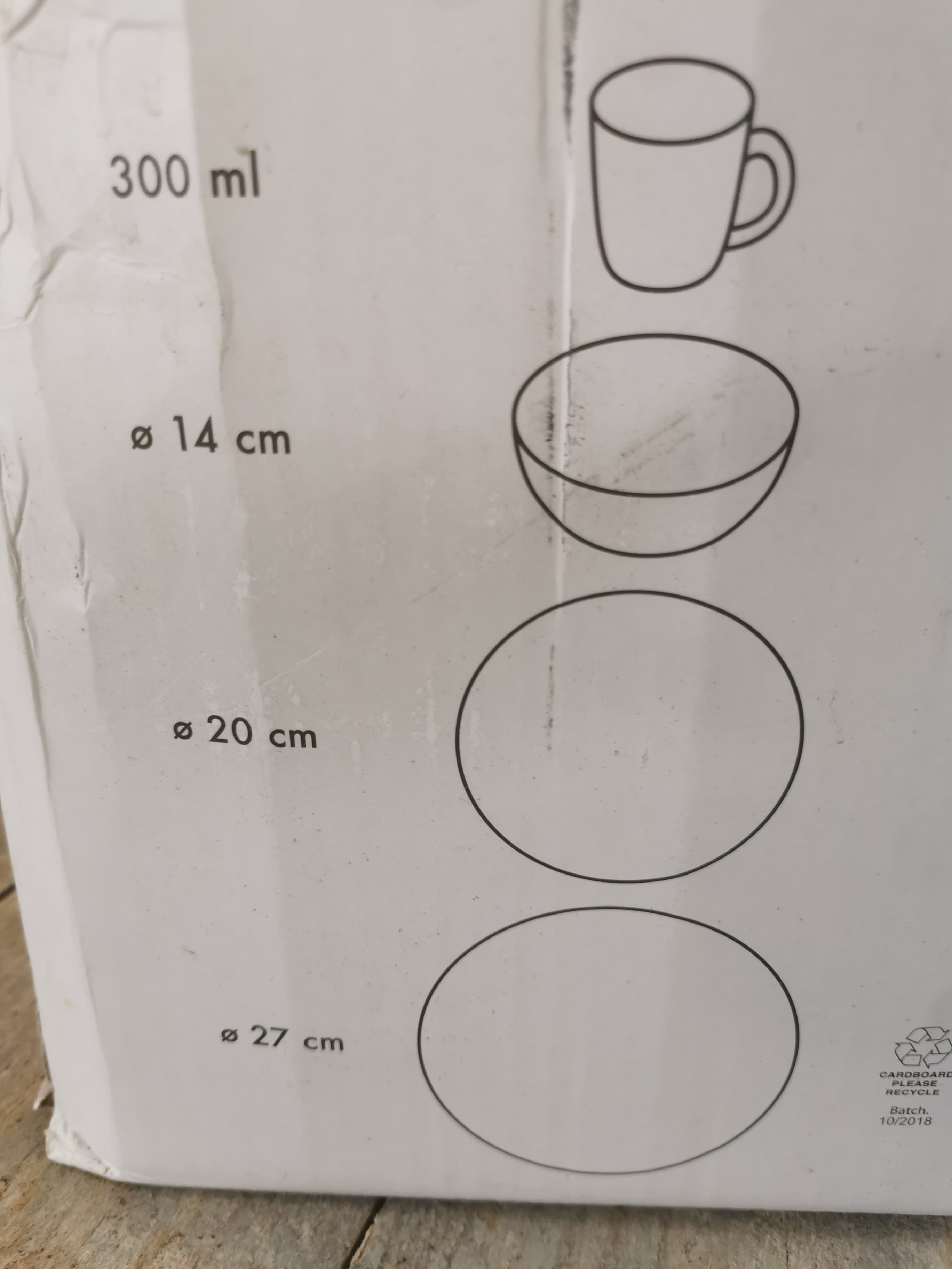 Onderdelen: 4 Dinerborden, 3 ontbijtborden, 4 kommen en 4 mokken