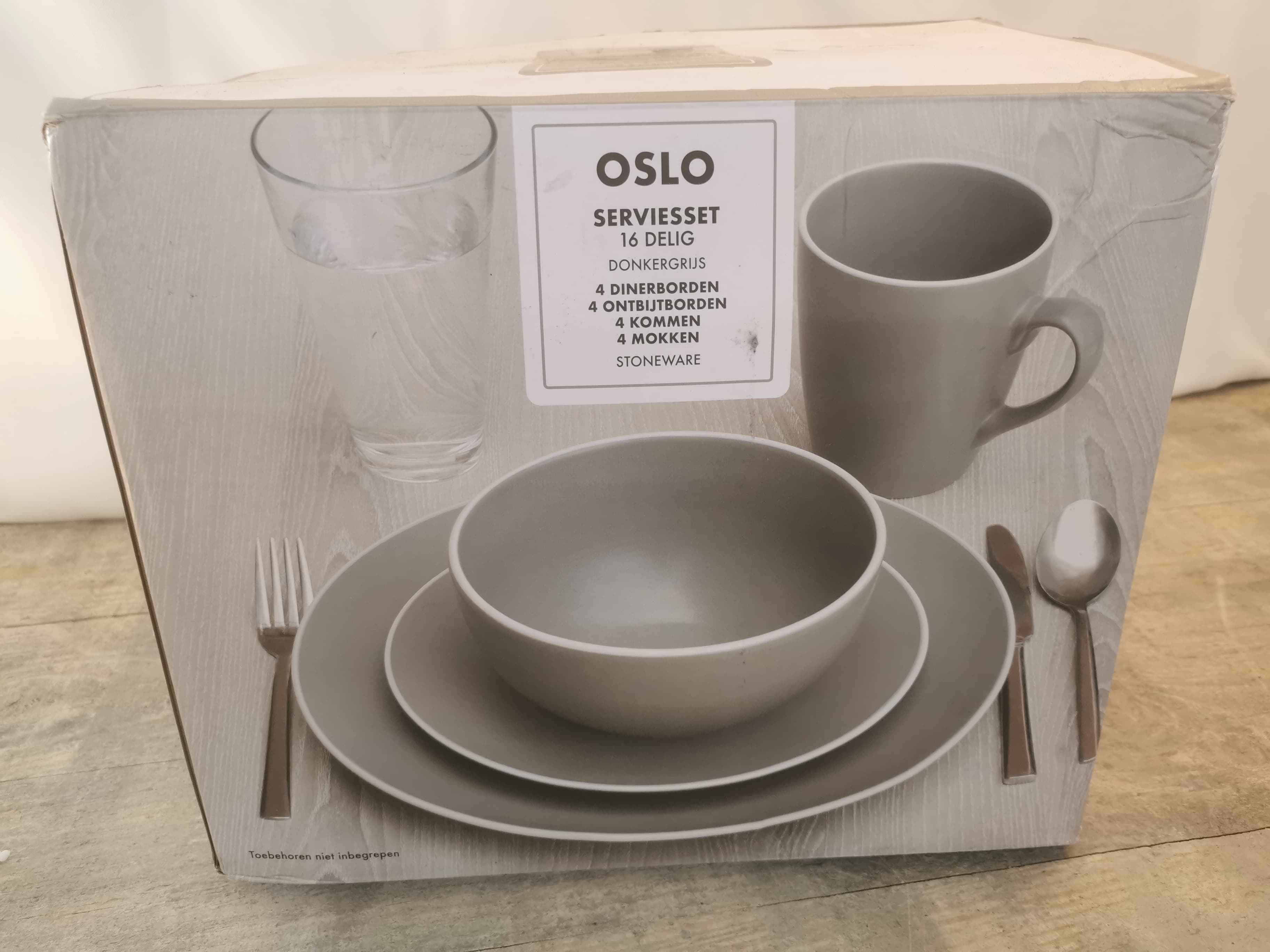 Productbeschrijving: Met deze stijlvolle 15-delige serviesset Oslo (lichtgrijs) ben je klaar voor iedere maaltijd. De set bestaat uit: 4 dinerborden, 3 ontbijtborden, 4 kommen en 4 mokken in het lichtgrijs en is daarmee geschikt voor 4 personen.