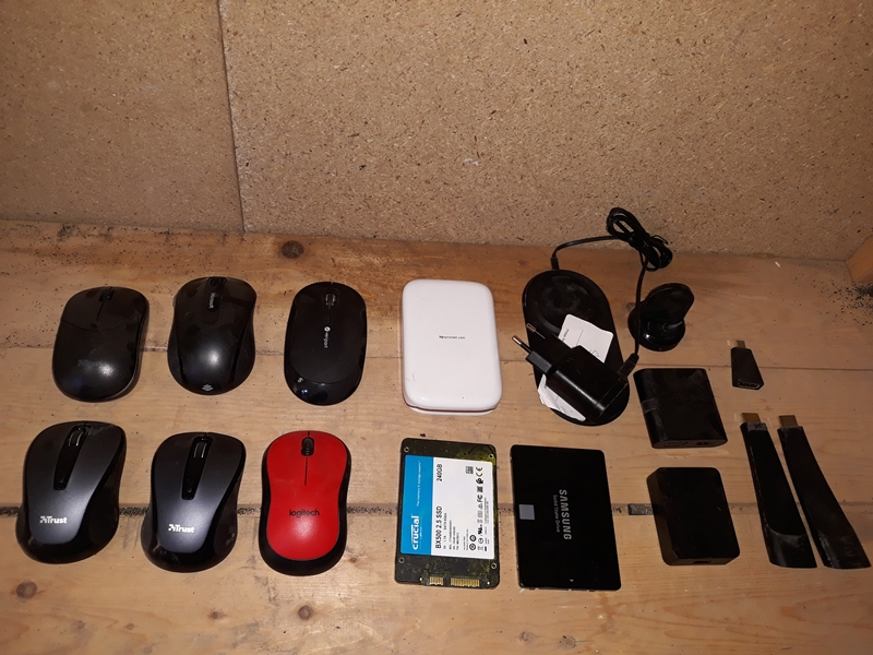 Bestaande uit: Types: Logitech Mk235, Trust 1876 toetsenbord en muis, Digital signane S-300, Pace DCR 711103, Samsung 860 FVO 2506B SSD, Dell PRO1X Docking station port replicator, Samsung SWA-8000S, Crucial BX500 SSD 240Gb 2.5, Intel compute stick STK1AW32X, Apple smart cover ipad 2017 rozenkwarts, logiteck K400+ zwart Azerty, 2x Trust Zelo silent click muis draadloos, Logitech M220 silent draadloze muis rood, Philips somicare diamondclean HX9394/92 chargingdock, HP sprocket, veripart compacte draadloze muis, microsoft wireless mobile mouse 4000, Dell USB-C naar multi port docking 470-abry en 2x Samsung galaxy watch docks
