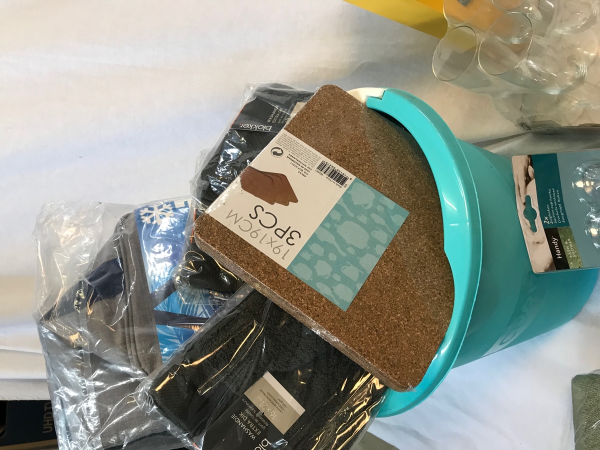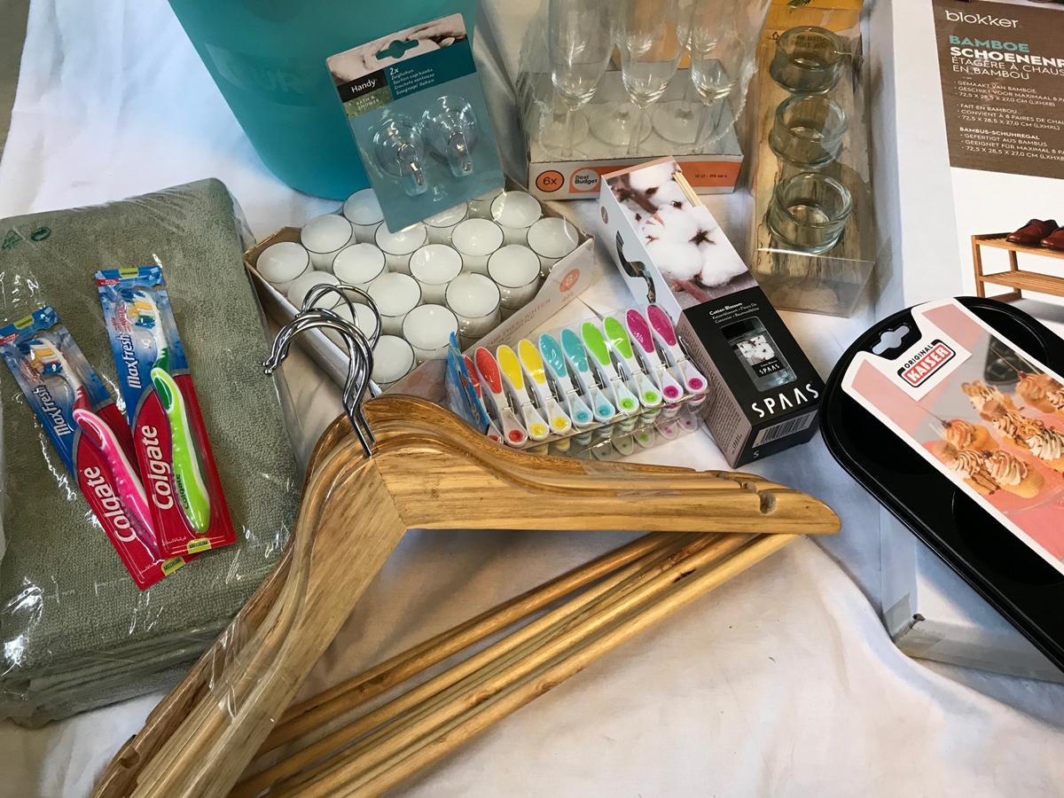 Bestaande uit: Bamboe schoenenrek, muffin bakvorm, 33cl rode wijn glazen, Brabantia Senseo pad houder, magnetron bakje, glazen vershouddoos, limonadekan, vershoudpot, lekker & Simpel kookboek, pizzasnijder, kaasschaaf, zeef, knijptank, geurstokjes, champagne glazen, douche zuighaken, 40 waxinelichtjes, theelichtjes houder, knijpers, kledinghangers, 10 extra zachte en dikke handdoekjes, pannen onderzetterss, koeltas, emmer, twee Colgate tandenborstels, 4 keukendoeken en een opblaas luchtbed