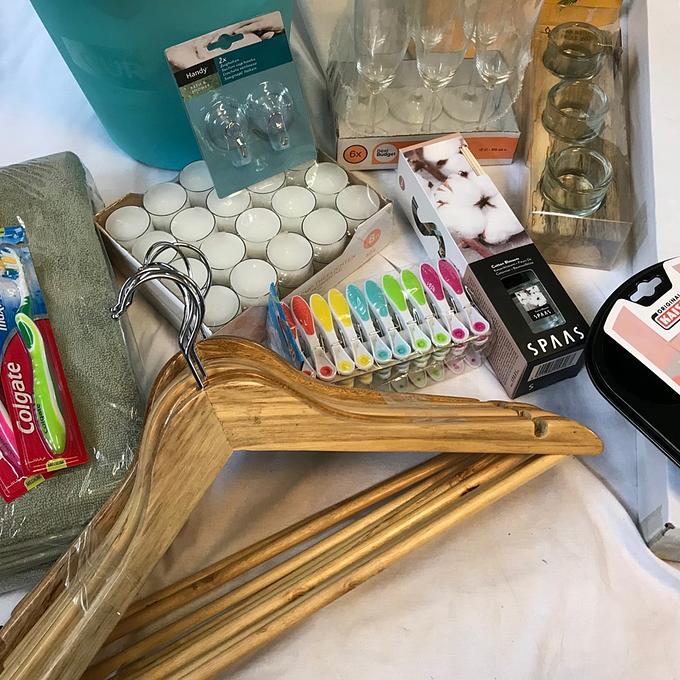 Bestaande uit: Bamboe schoenenrek, muffin bakvorm, 33cl rode wijn glazen, Brabantia Senseo pad houder, magnetron bakje, glazen vershouddoos, limonadekan, vershoudpot, lekker & Simpel kookboek, pizzasnijder, kaasschaaf, zeef, knijptank, geurstokjes, champagne glazen, douche zuighaken, 40 waxinelichtjes, theelichtjes houder, knijpers, kledinghangers, 10 extra zachte en dikke handdoekjes, pannen onderzetterss, koeltas, emmer, twee Colgate tandenborstels, 4 keukendoeken en een opblaas luchtbed