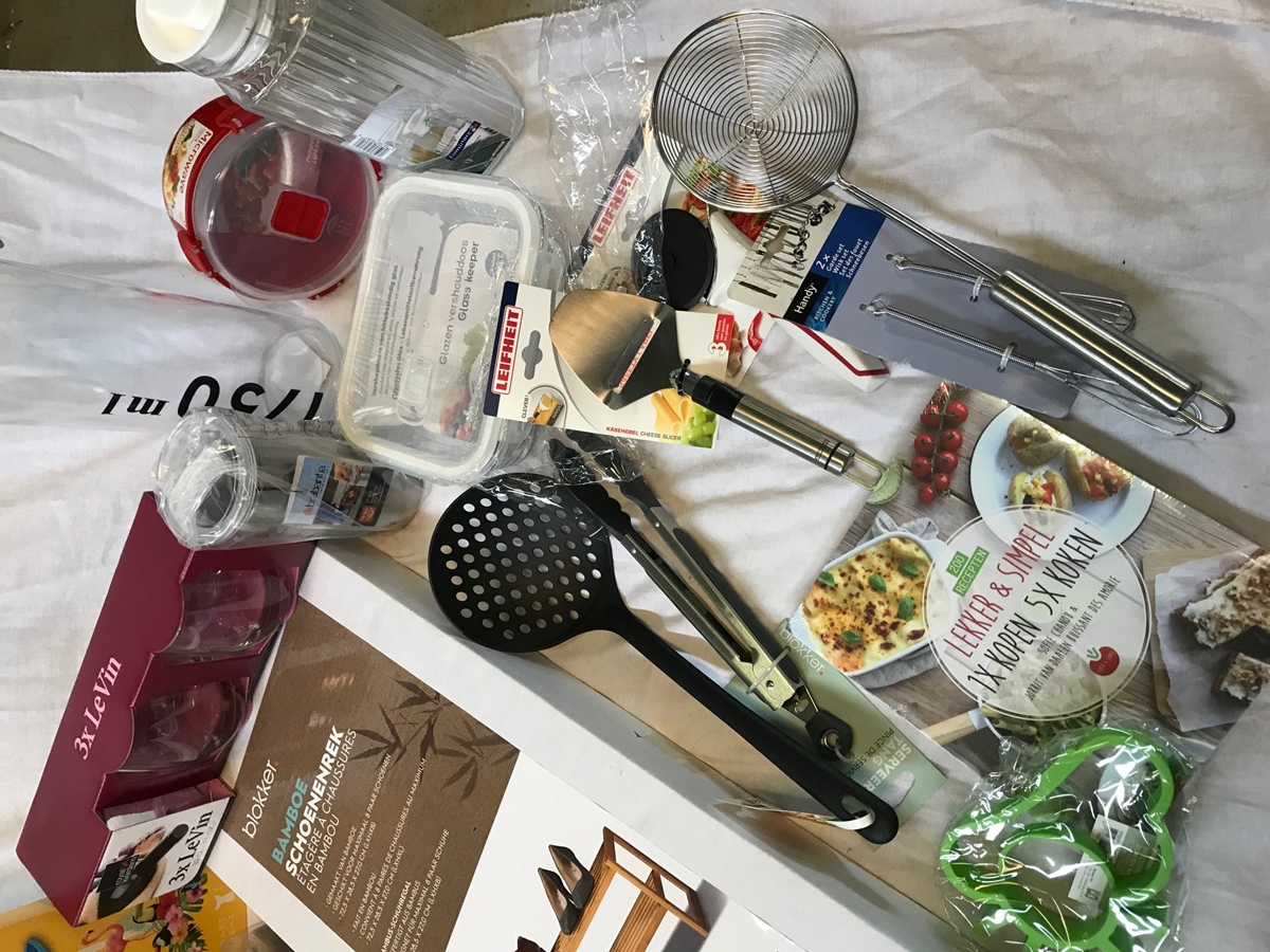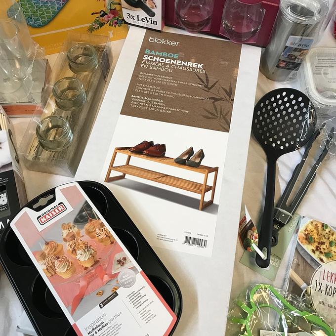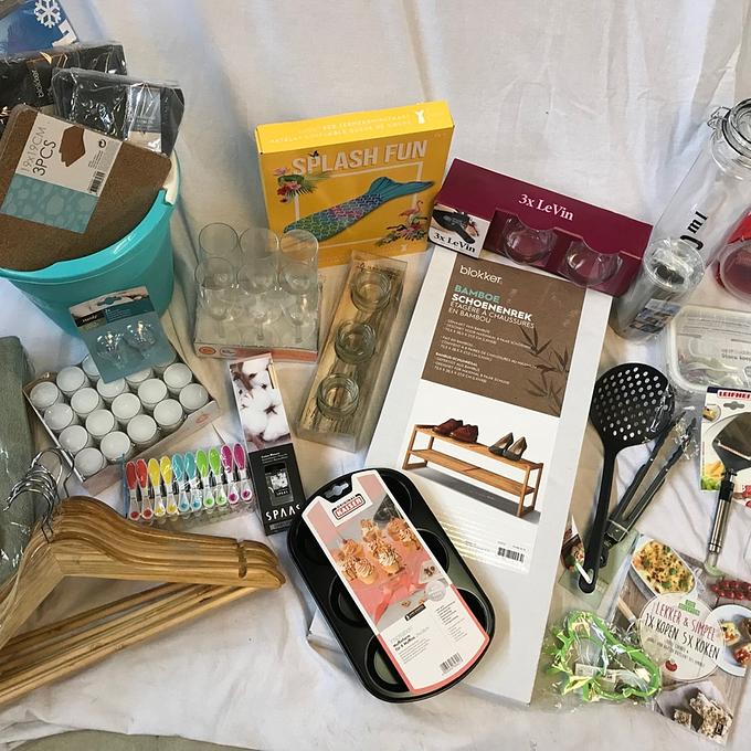 Bestaande uit: Bamboe schoenenrek, muffin bakvorm, 33cl rode wijn glazen, Brabantia Senseo pad houder, magnetron bakje, glazen vershouddoos, limonadekan, vershoudpot, lekker & Simpel kookboek, pizzasnijder, kaasschaaf, zeef, knijptank, geurstokjes, champagne glazen, douche zuighaken, 40 waxinelichtjes, theelichtjes houder, knijpers, kledinghangers, 10 extra zachte en dikke handdoekjes, pannen onderzetterss, koeltas, emmer, twee Colgate tandenborstels, 4 keukendoeken en een opblaas luchtbed