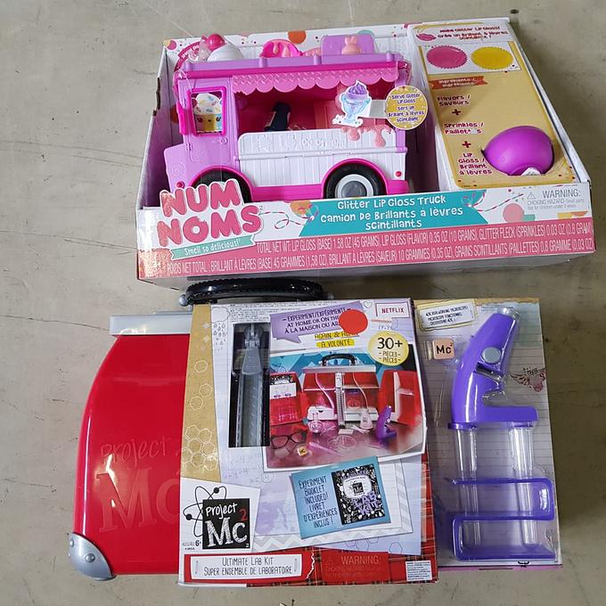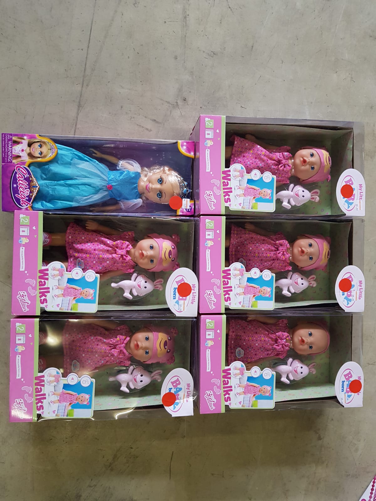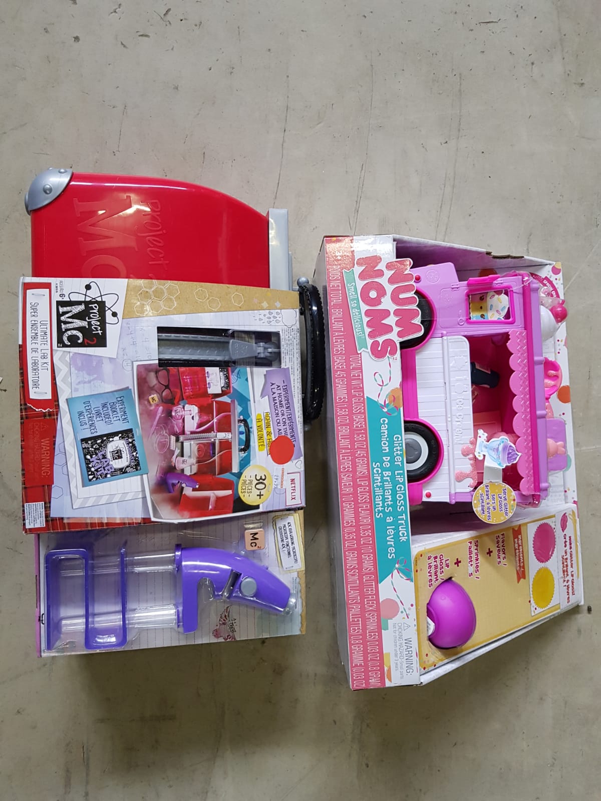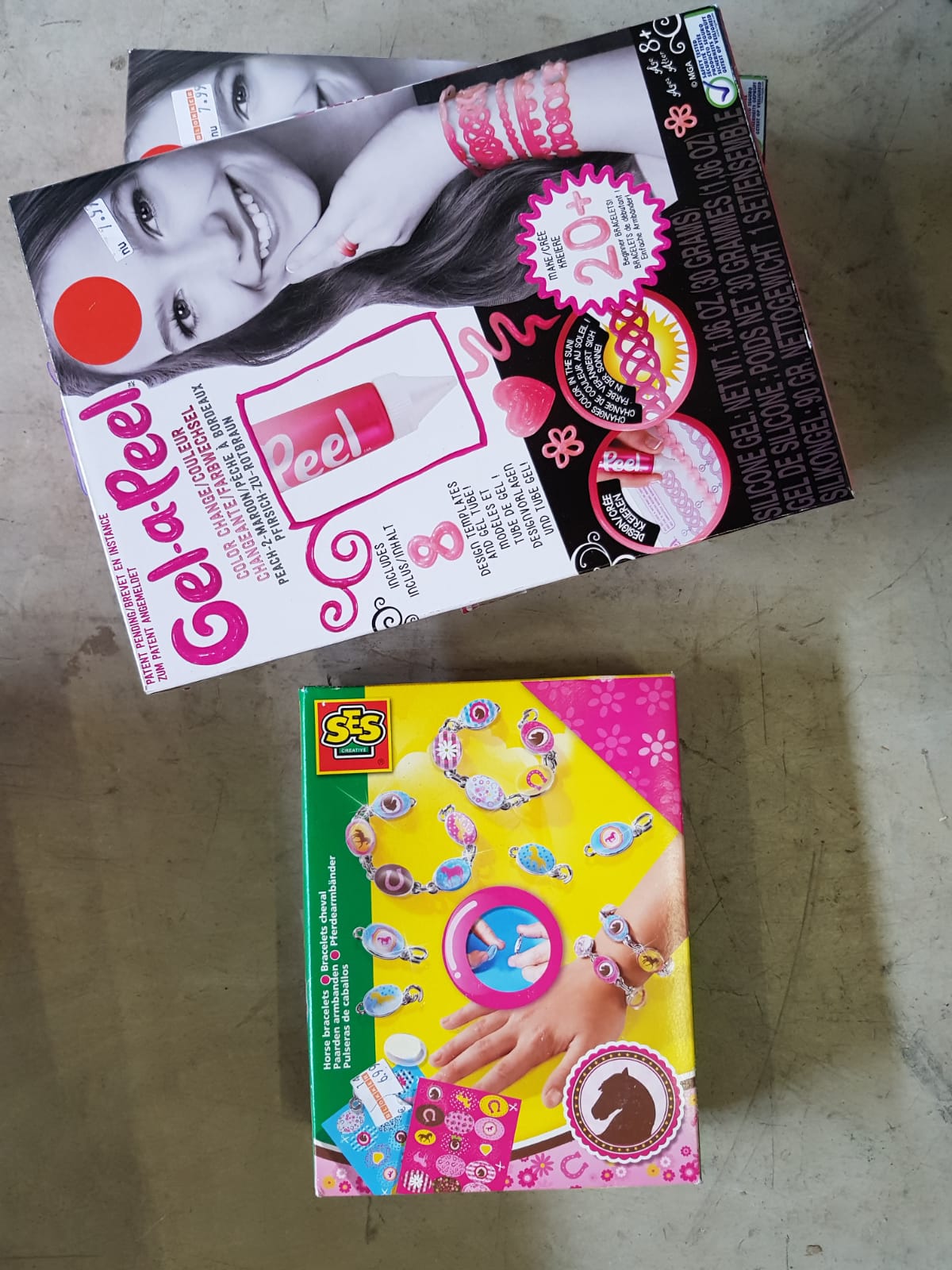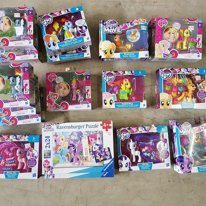 Bestaande uit: 17 My Little Pony speelgoed, SES paardenarmbanden maken, 2x Gel-a-Peel gekleurde pennen, doos K3 speelgoed, Num Noms ijskraam, Project MC2 ultimate labkit, 5 Baby Born poppen, 2 Calleigh prinsessenpoppen, 14 prinsessenverkleedsets