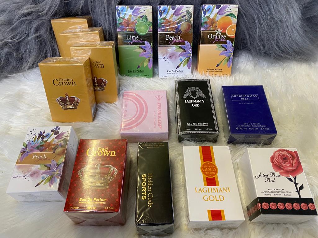 Bestaande uit: een grote set heerlijke parfums en bodylotions met fruitige, luxe geuren, zie foto's. De partij bevat de volgende 15 parfums: 4x Golden Crown parfum + bodylotion, Red Crown, Hidden Code Sports, Laghmani Gold, Laghmani Oud, Metropolitan Blue, Juliet Rose Red, Dunlop GRID Girl, Lime Jardin, Peach Jardin, Orange Jardin, Peach Jardin parfum + bodylotion