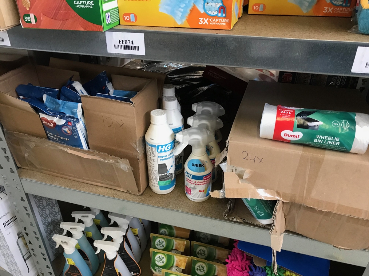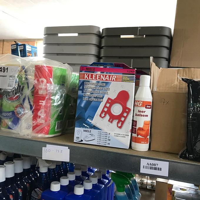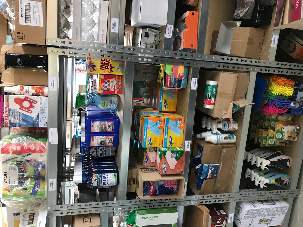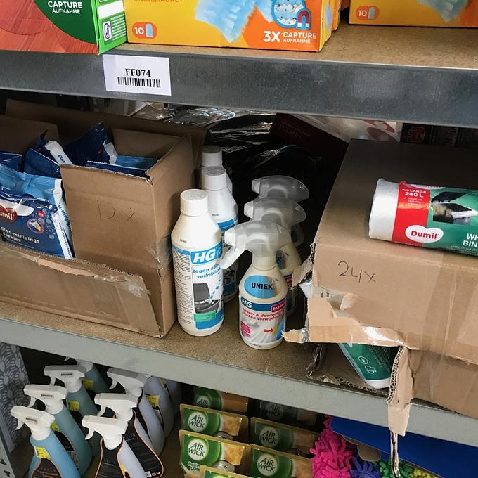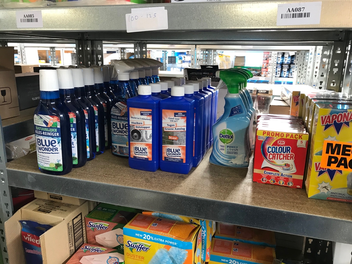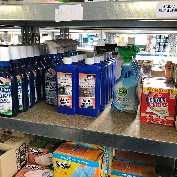 Bestaande uit: 17x Bluewonder allesreiniger, 4x Bluewonder vloeibare ontstopper, 8x Bluewonder tegen groene aanslag, 4x Dettol allesreiniger, 10x K2r colour catcher, 6x Vapano mega pack anti mug stekker, 60x Vileda sensitive handschoenen, 5x Swiffer 36 sleeves, 11x Swiffer duster (10 pack), 24x10 containerzakken, 3x HG Zweet- en deodorant vlekken verwijderaar, 3x HG tegen stinkende vuilnisbakken, 12x Dumil glas-reinigingsdoekjes, 25 Lifetime Clean Dusters, 9 Air Wick automatische spray, 9x Royal patio kunststofreiniger, 17x20 rekband vuilniszakken 30L, 2x HG leer balsem, 3x Kleenai stofzuigerzakken en 10 Plenty compact keukenrol. zie foto's