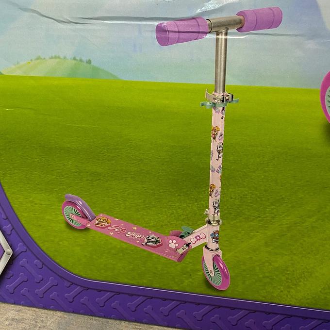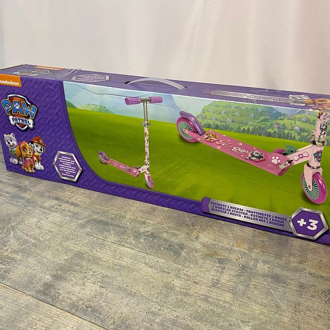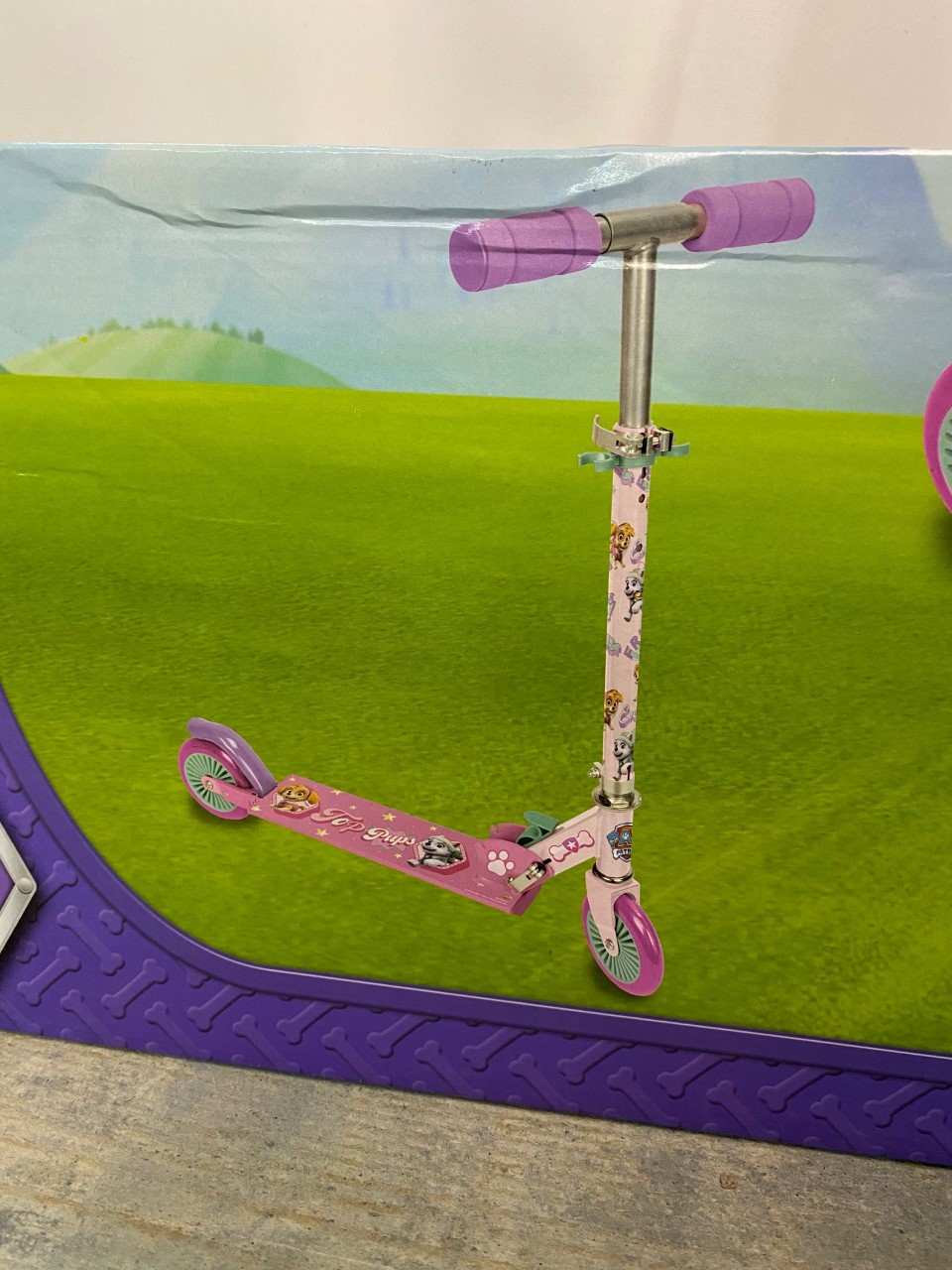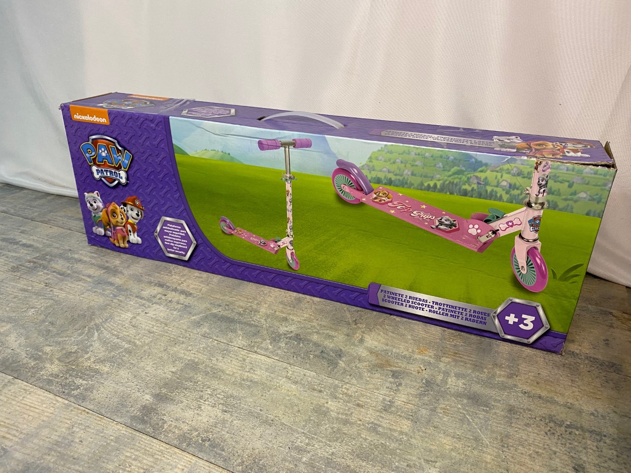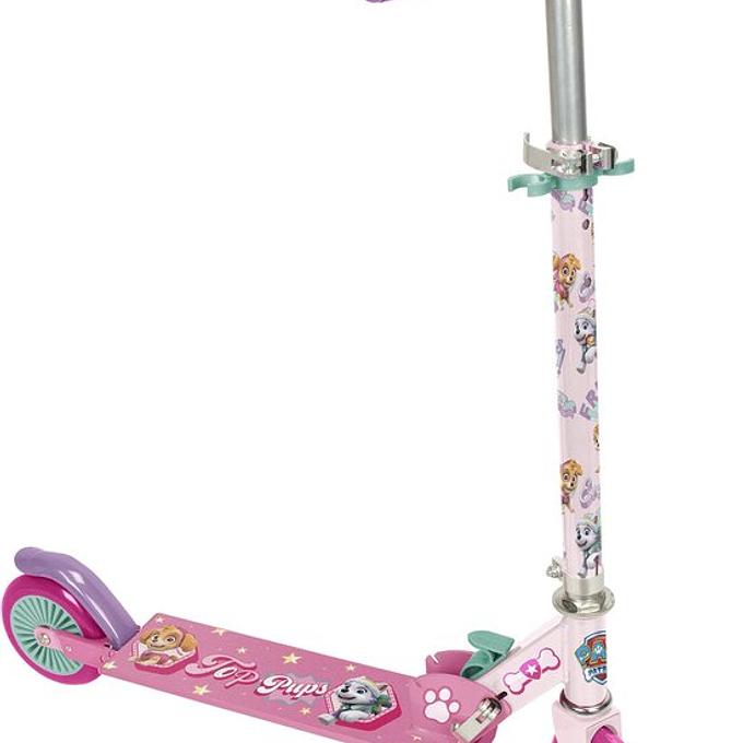 Productbeschrijving: Roze opvouwbare scooter met de personages Skye, Everest en Marshall uit de Paw Patrol tv-serie.