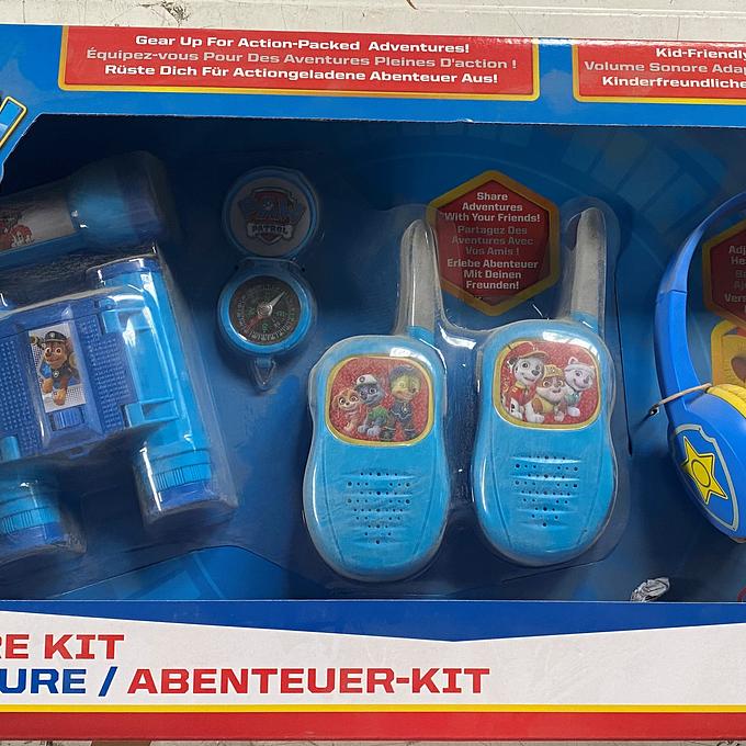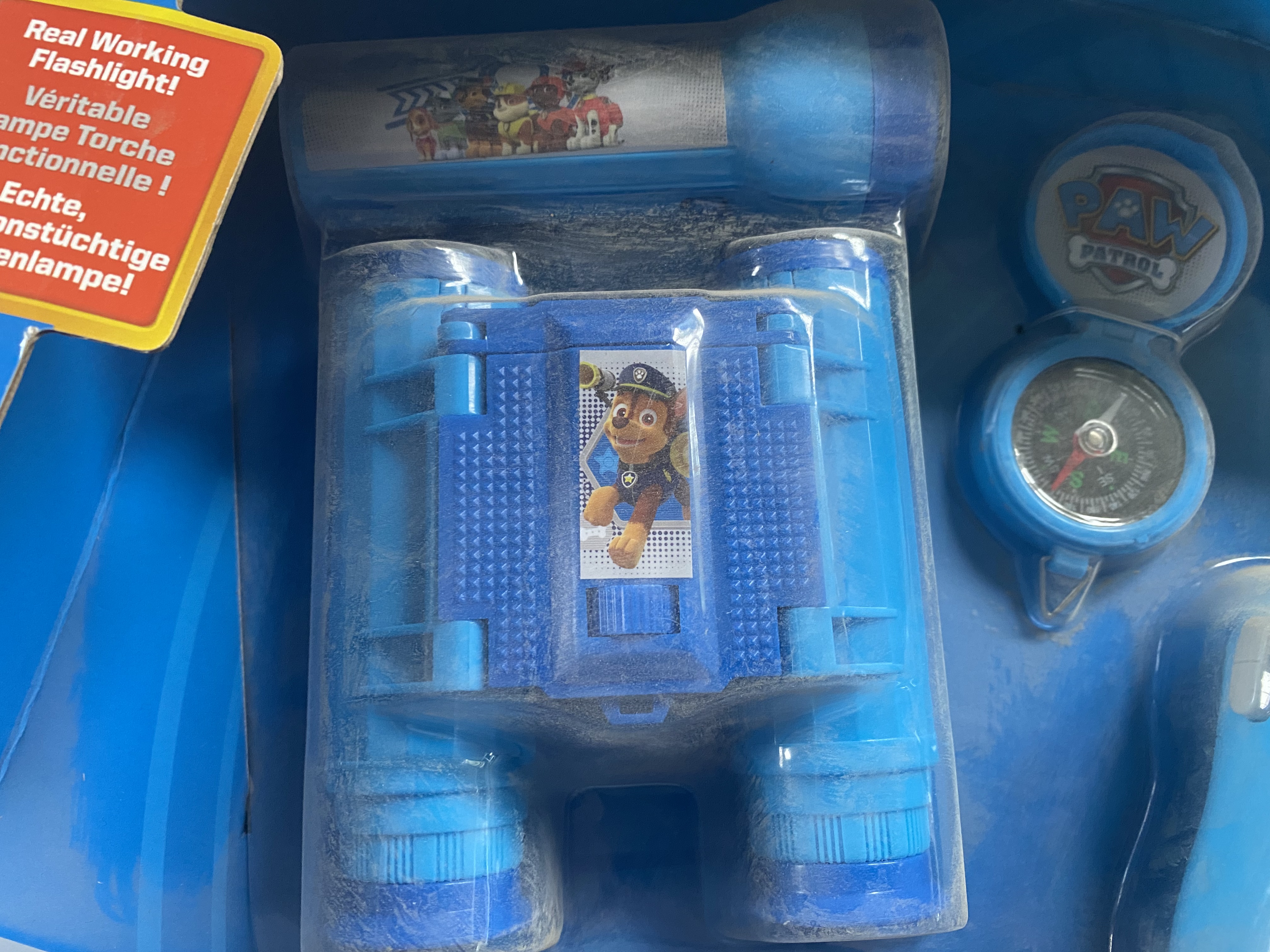 Productbeschrijving: Paw Patrol ontdekkingsreiziger set, bestaande uit: 2 walkie talkies, 1 zaklamp, 1 verrekijker en 1 kompas. De set in blauw met geel bevat opdrukken van de figuren Chase (politie), Marshall (brandweer) en Rubble (bouwvakker).