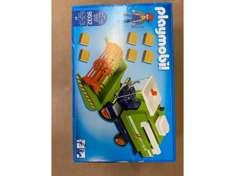 Productbeschrijving: Playmobil 9532 maaidorser. Het graan kan worden geoogst! De boer neemt plaats in de Playmobil combine en gaat aan het werk. De stroblokken kunnen boven in de maaidorsmachine worden ingevoerd waarna ze tijdens het rijden er aan de achterkant weer uit komen. Inclusief 1 Playmobil speelfiguur.