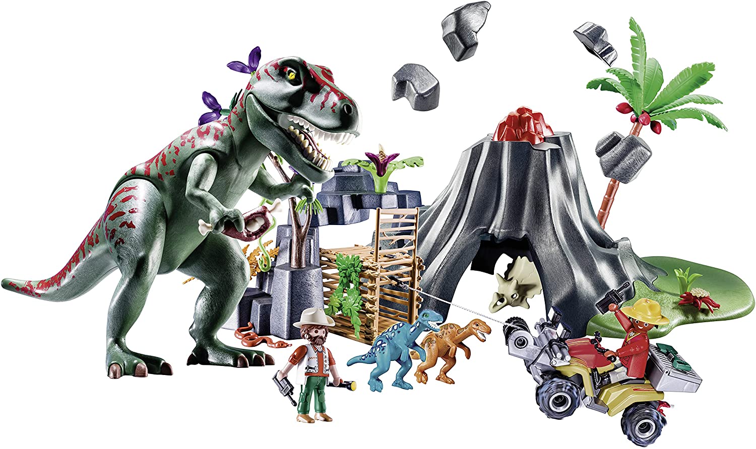 Productbeschrijving: Voorzien van een uitbarstende vulkaan, die wordt geactiveerd met een knop Inclusief een quad Quad bike wordt geleverd met een werkende lier en een koppelhaak Inclusief T-Rex met beweegbare kop, kaak, armen en benen Raptor dinosaurus inclusief Met afsluitbare kooi