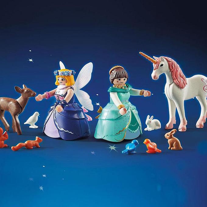 Productbeschrijving: Marla in haar baljurk en de Goede Fee in het Sprookjeskasteel. Met veel accessoires, schattige bosdieren en een eenhoorn.