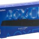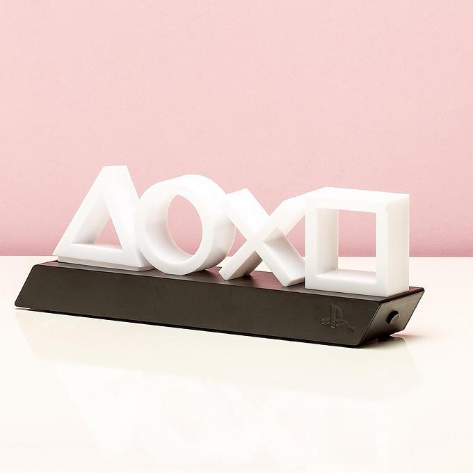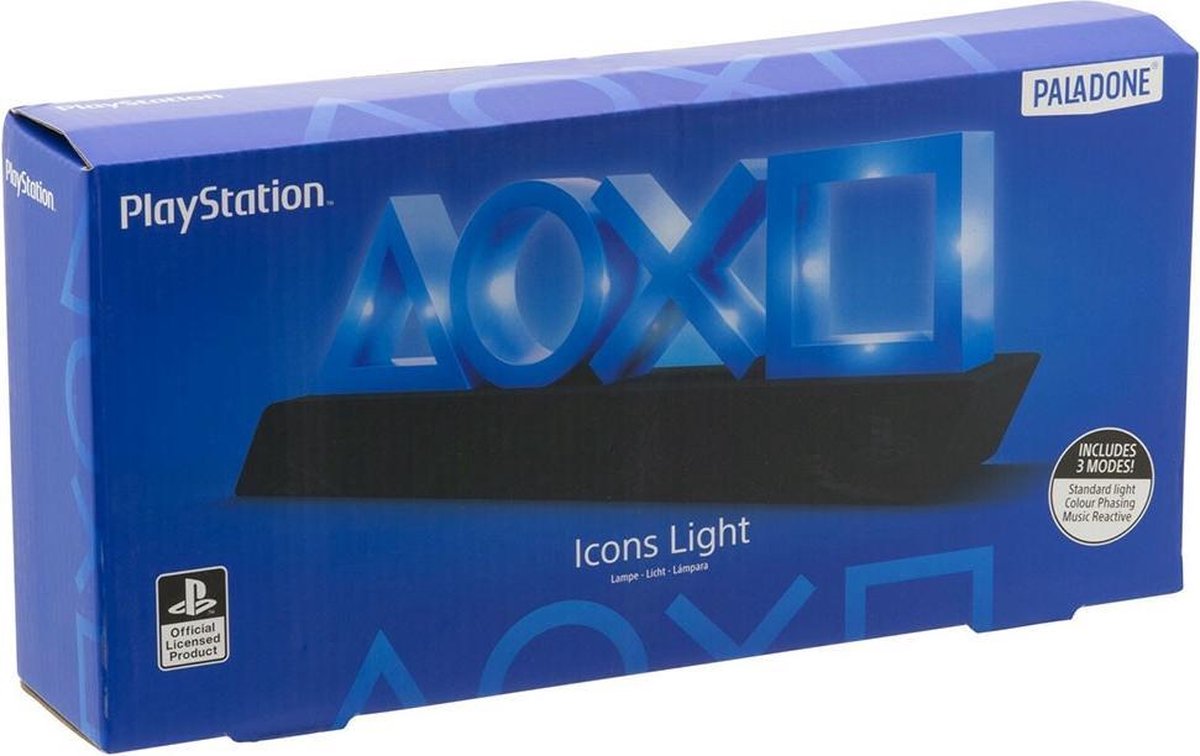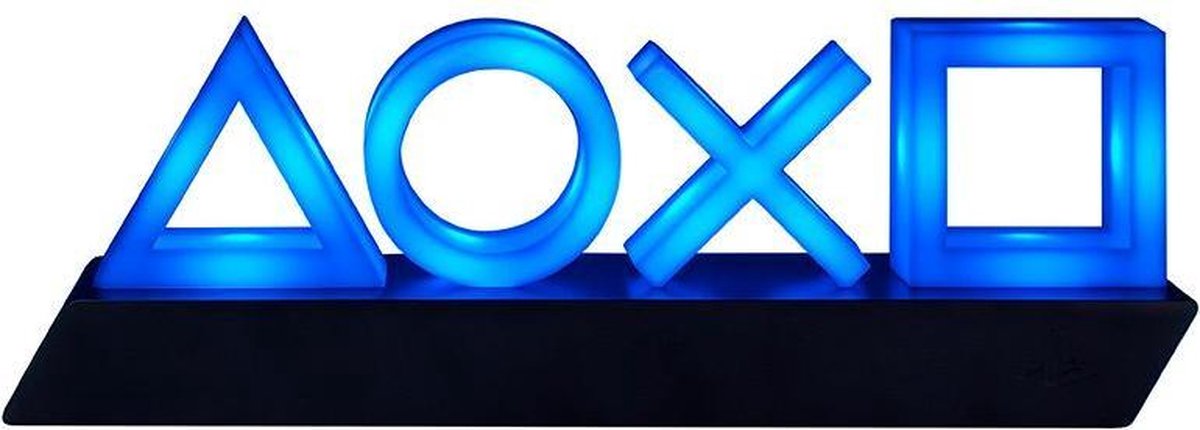 Productbeschrijving: Icons Light van PlayStation. Lamp met symbolen van PlayStation 5 controller. Bestaat uit een witte driehoek, x, cirkel en vierkant. De lamp geeft blauw licht.