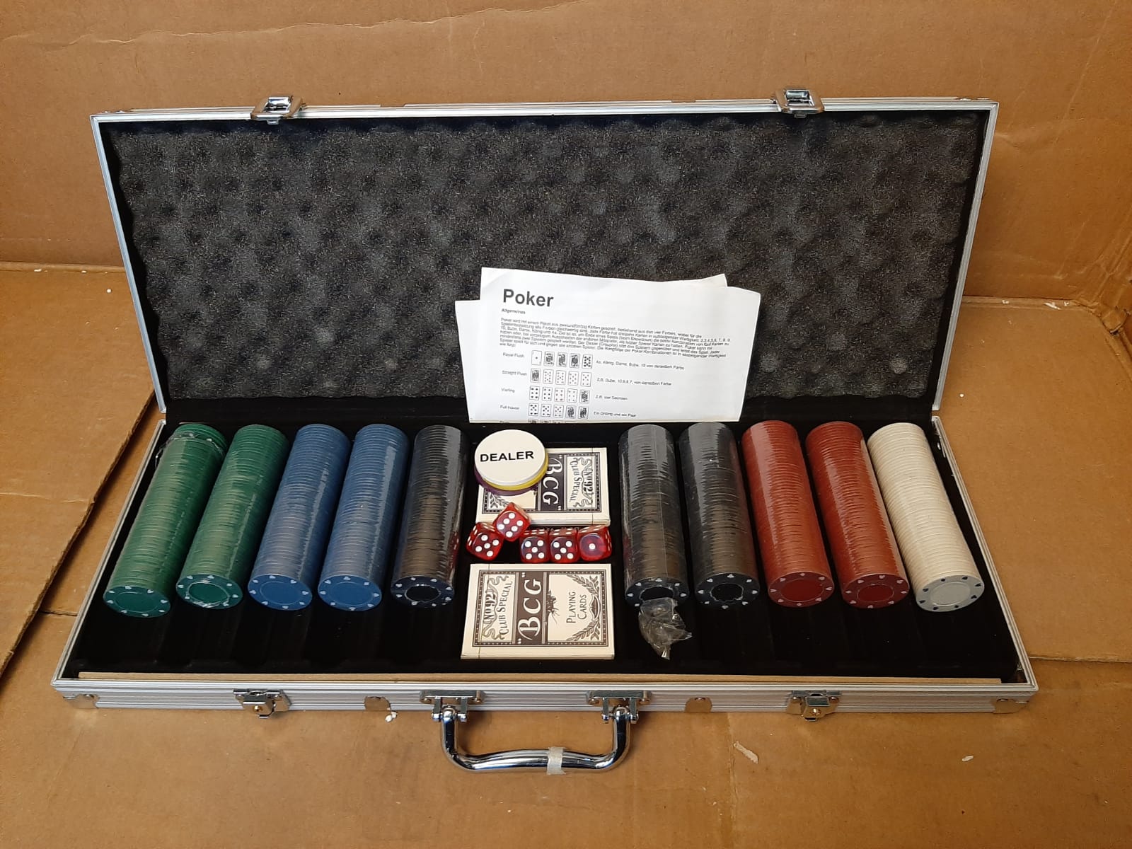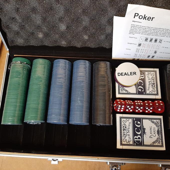 Bijzonderheden: de sluiting van de koffer is gebrekkig aan een kant en sommige rollen met chips zitten niet langer in het plastic