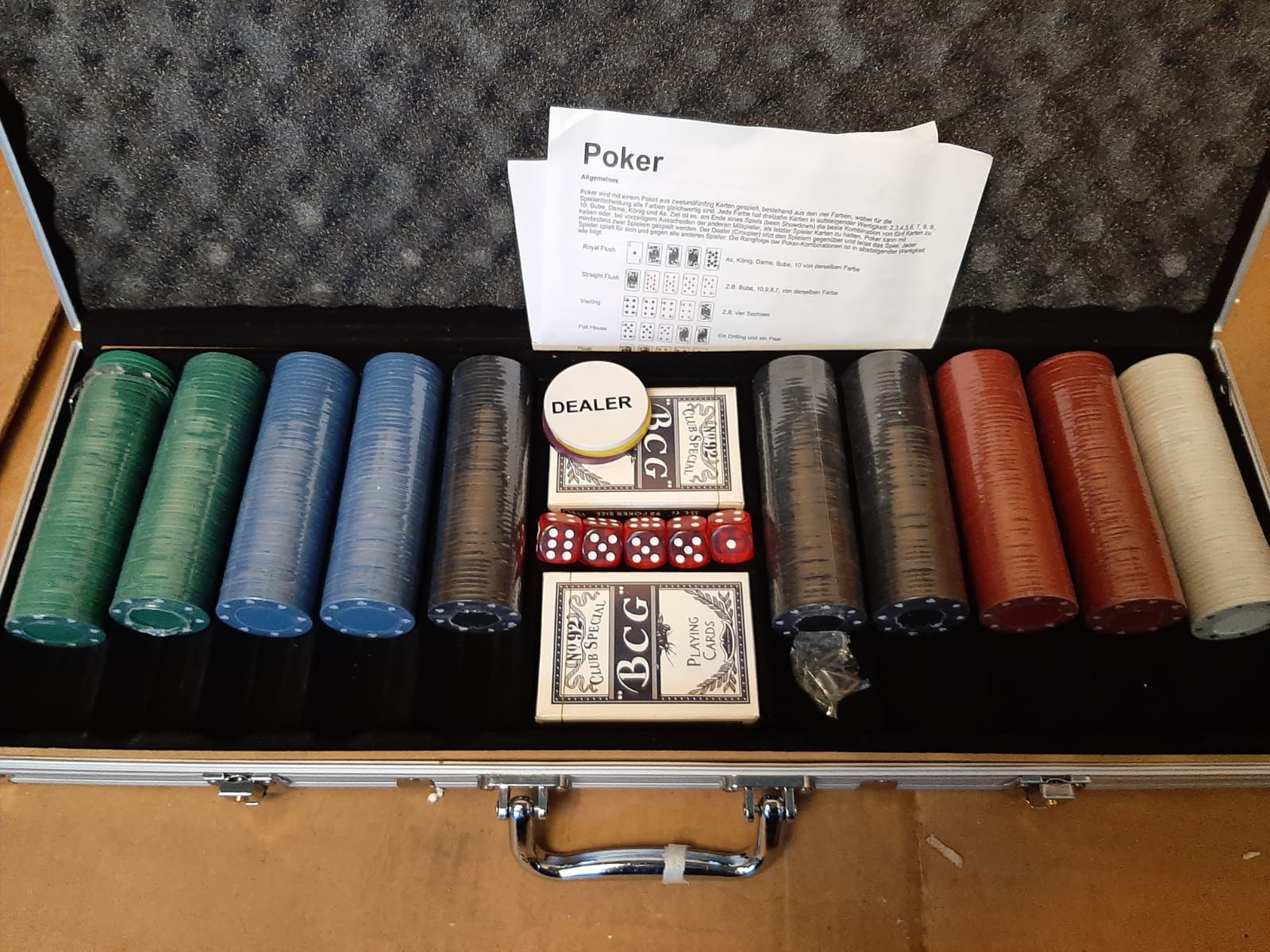 Bijzonderheden: de sluiting van de koffer is gebrekkig aan een kant en sommige rollen met chips zitten niet langer in het plastic