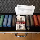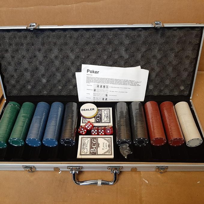 Productbeschrijving: Deze pokerset is een goede introductie voor beginners en hobbyspelers die thuis willen genieten van een casinogevoel. De 500 gekleurde plastic pokerchips hebben geen waarde opdruk, dit heeft als voordeel dat je de waarden zelf kunt bepalen. 1 dealer button, 1 "big blind" en 1 "small blind" knop, 2 decks van 54 pokerkaarten, 5 casino dobbelstenen maken de complete pokerset compleet. De gewatteerde aluminium koffer heeft 2 afsluitbare gespsloten en wordt geleverd met 2 sleutels.
