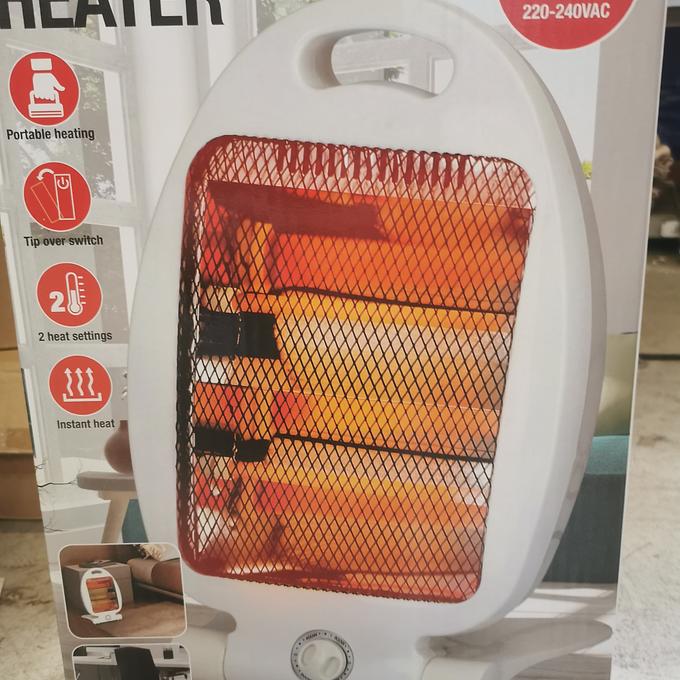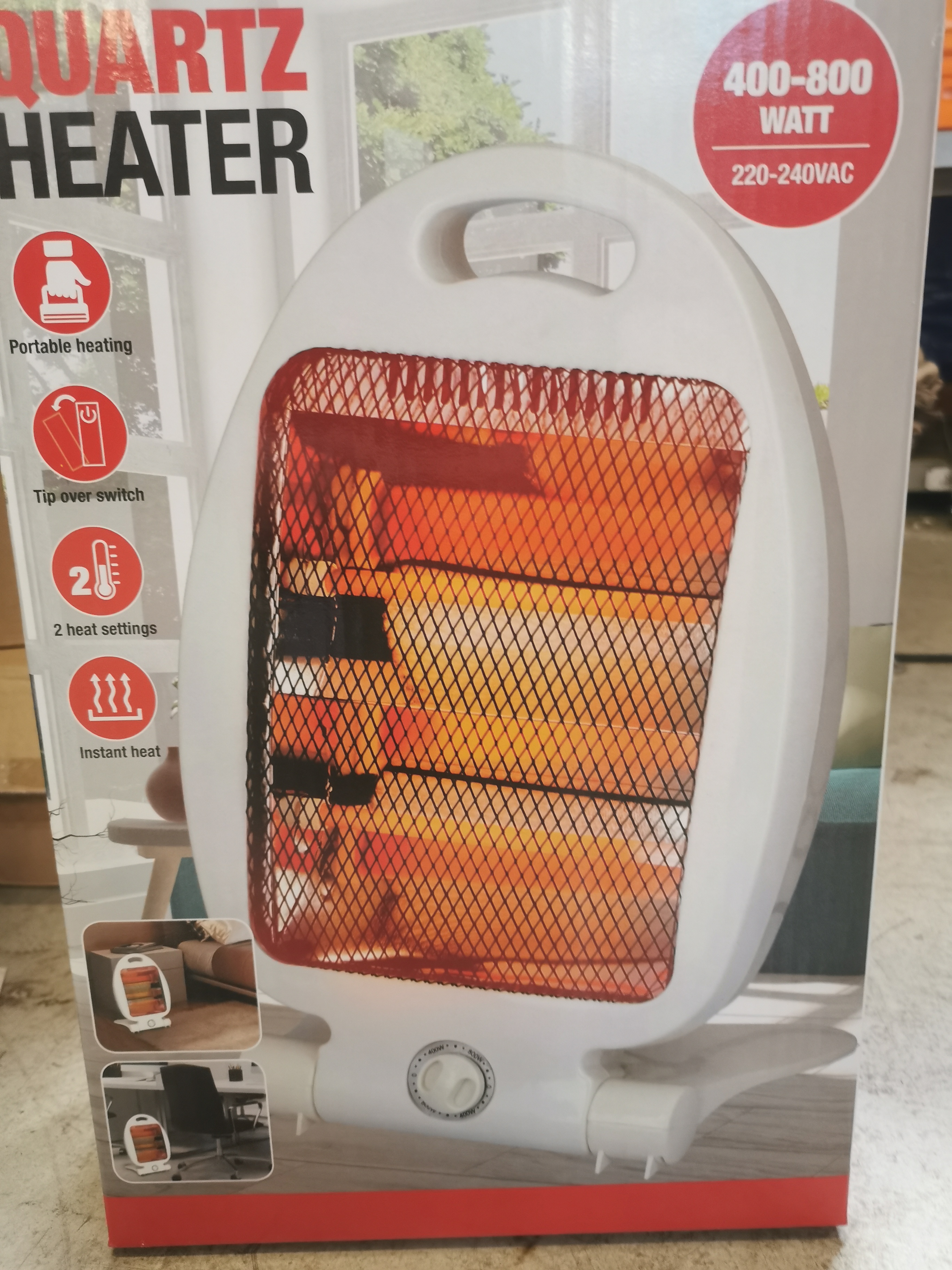Productbeschrijving: Quarts heater met 400-800 Watt vermogen. De heater is kantelbaar en heeft twee verschillende standen. Product is direct warm.