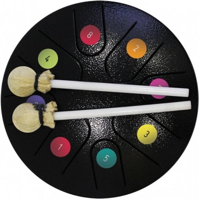 Productbeschrijving: 8 inch stalen tongue durm, professioneel gestemd op C Major met 1 volle octaaf en 8 noten. Staat op 3 isolerende rubber pootjes, en geleverd met 2 soft cover hamertjes en easy to play song cards.