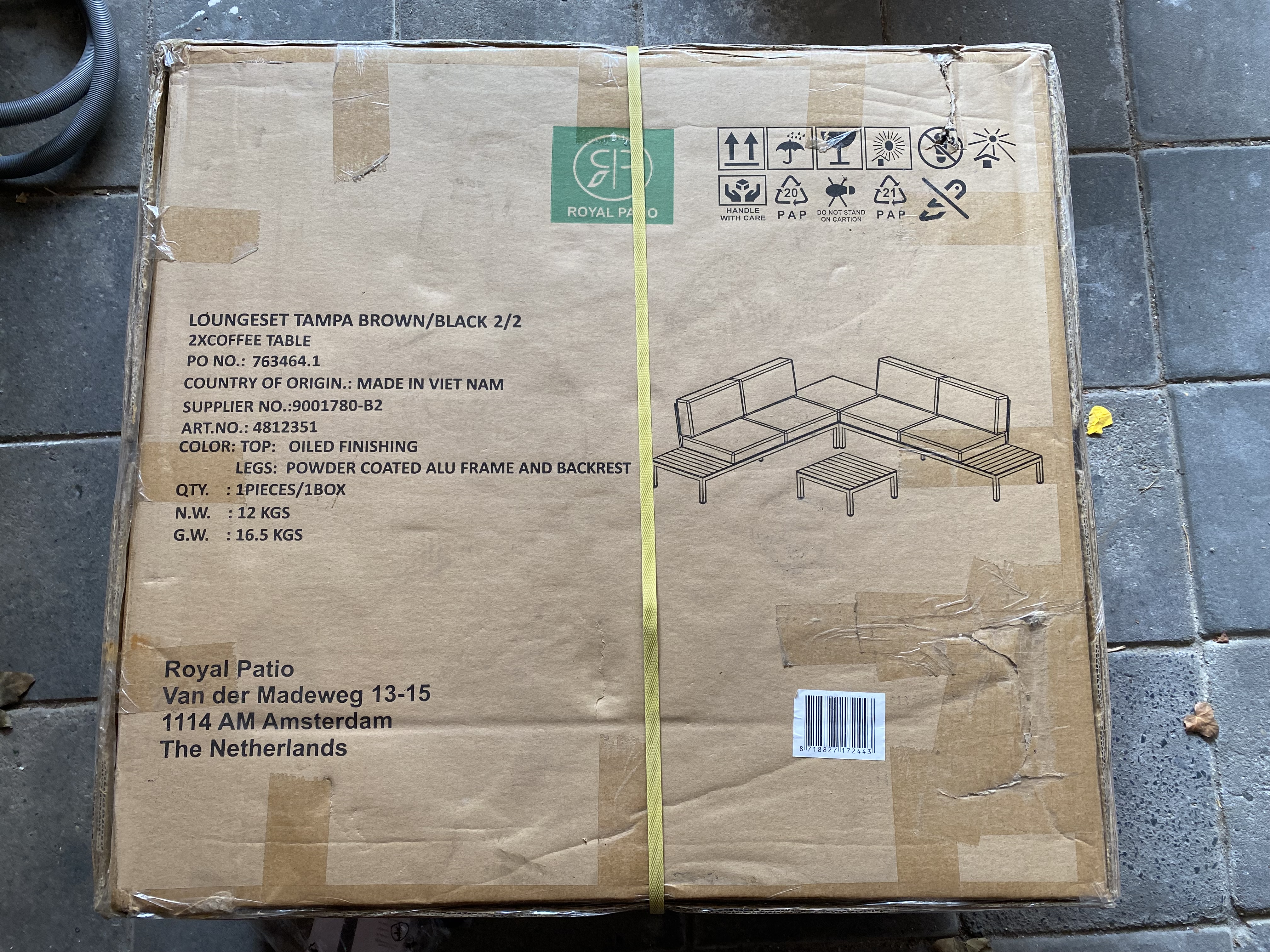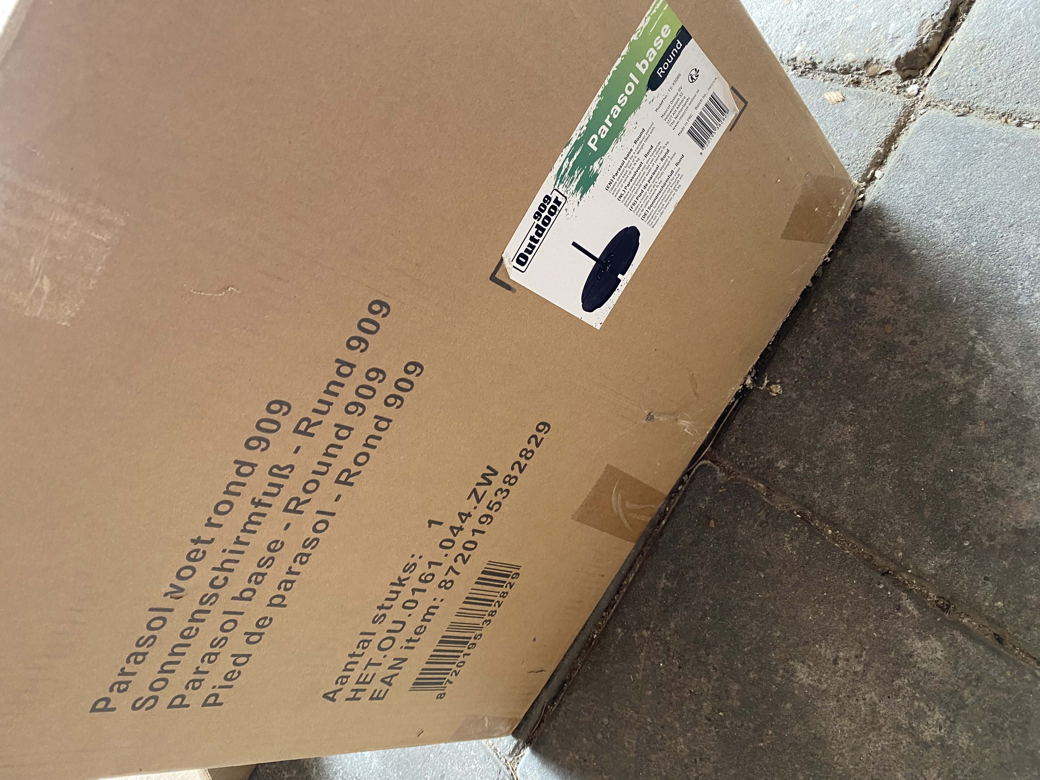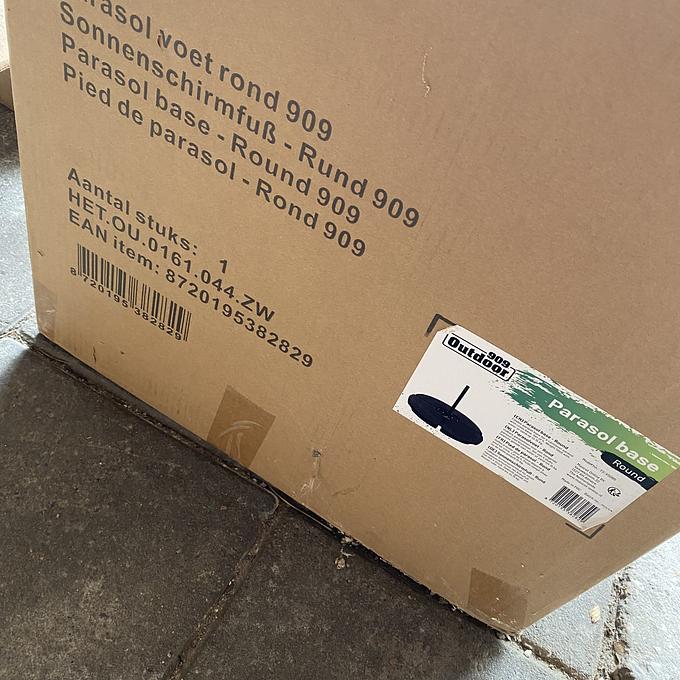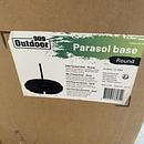 Royal Patio LYON dining table, Outdoor 909 parasolvoet rond zwart (opvulbaar), Royal Patio lounge set, witte plaat, partij tuinstenen