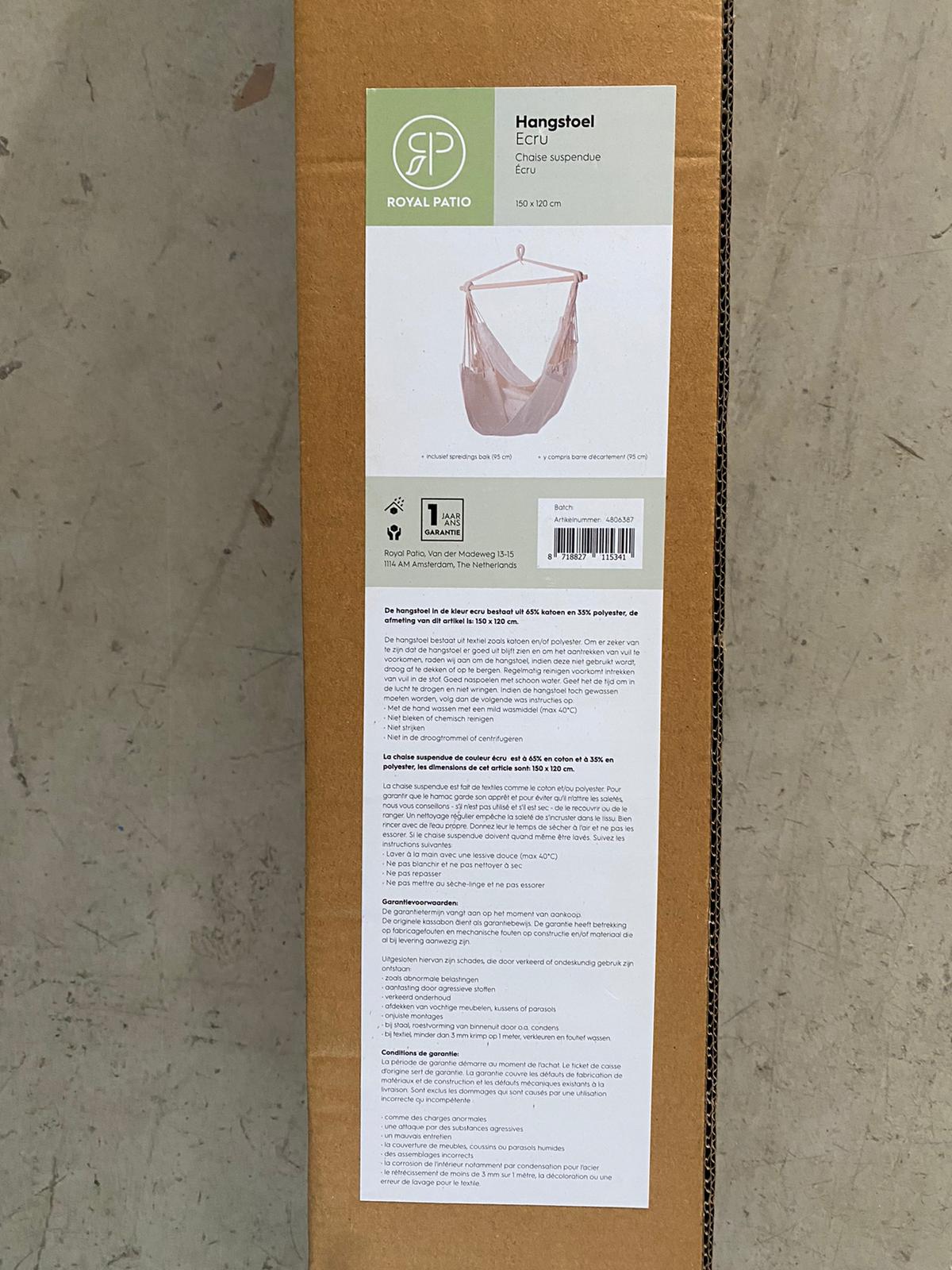 Productbeschrijving: Deze hangstoel in de kleur ecru bestaat uit 65% katoen en 35% polyester. Deze hangstoel is ideaal om lekker in te hangen en te ontspannen in jouw tuin. Maar deze hangstoel is ook een trendy aanwinst voor binnen. De hangstoel is inclusief spreidingsbalk (95 cm) voor perfecte comfort. De afmeting van deze hangmat is: 150 x 120 cm.