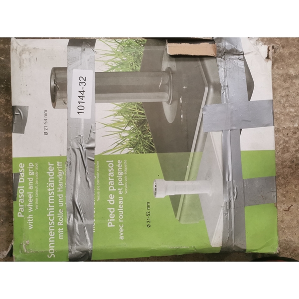 Productbeschrijving: Deze parasolvoet is gemaakt van beton en is 20 kg zwaar. Met deze parasolvoet kun je een (kleine) parasol perfect op zijn plaats houden. De voet is grijs van kleur en heet een afmeting van 45x11 cm. Deze parasolvoet in geschikt voor parasols met een doorsnee van maximaal 2 meter en met een stokmaat van 21-54 mm.Nu met nieuwe gepatenteerde SuperGrip klemmoer. Dankzij deze klemmoer 4 x meer grip waardoor de parasolstok steviger wordt vastgeklemd. Door het gebruik van een speciale kunststof komen er geen beschadigingen aan de parasolstok.