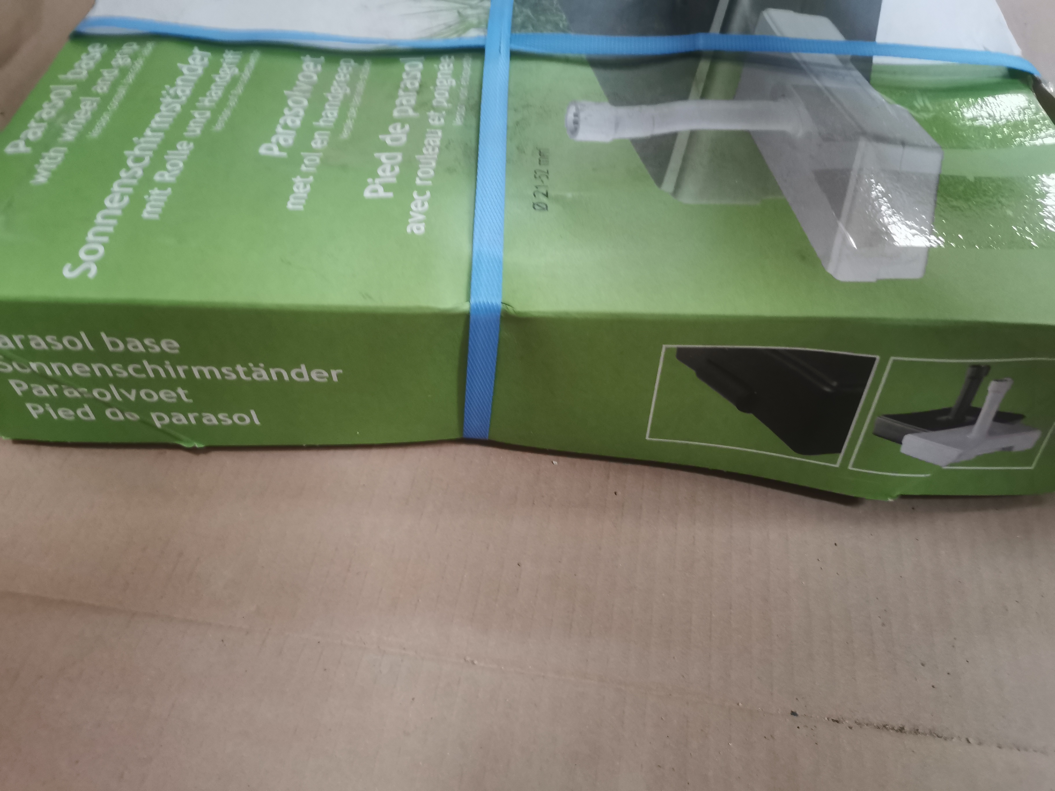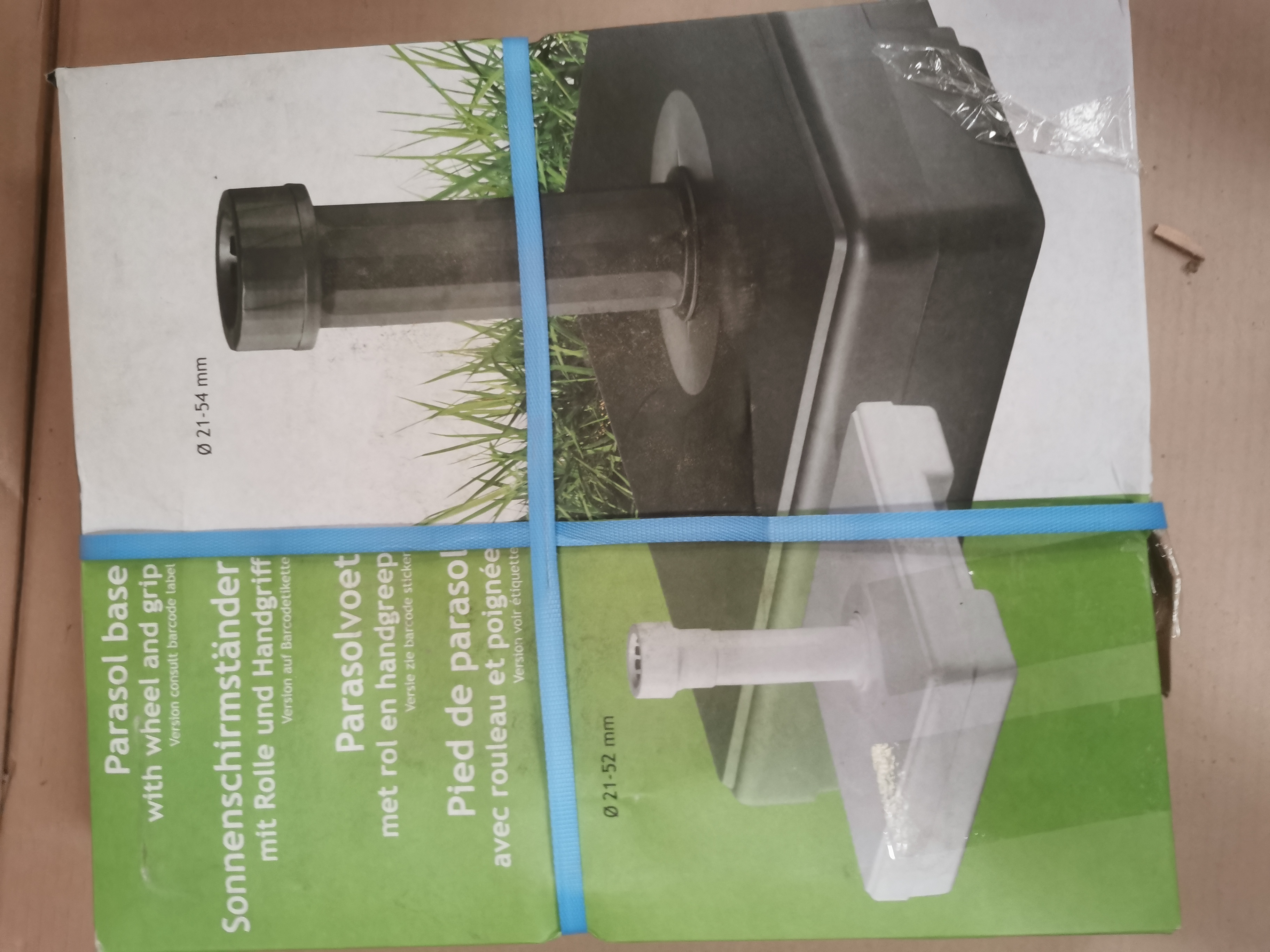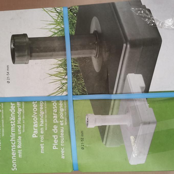 Productbeschrijving: Deze parasolvoet van het merk Royal Patio is gemaakt van beton met een kunststof kap en is 30 kg zwaar. Met deze parasolvoet kun je een parasol tot ø300 cm perfect op zijn plaats houden. Deze parasol is geschikt voor parasols met een stokdiameter van 2,1 tot 5,4 cm. Deze parasolvoet heeft wieltjes waarmee de voet gemakkelijk te verplaatsen is.