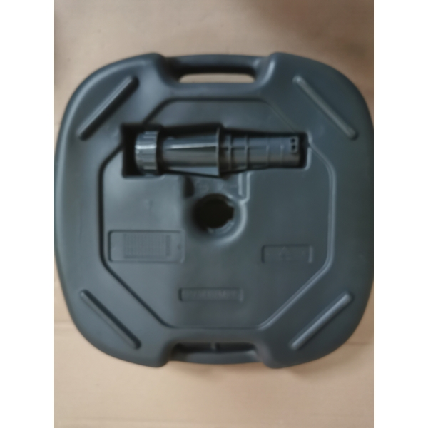 Productbeschrijving: Deze parasolvoet van het merk Royal Patio dient gevuld te worden met water of zand om hem te verzwaren. Er kan maar liefst 20 liter in de parasolvoet. Dit is zwaar genoeg om een parasol tot ø180 cm perfect op zijn plaats te houden. Deze parasol is geschikt voor parasols met een stokdiameter tot 3,5 cm. De voet is grijs van kleur en heeft een handvat zodat je hem gemakkelijk kunt verplaatsen.