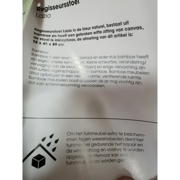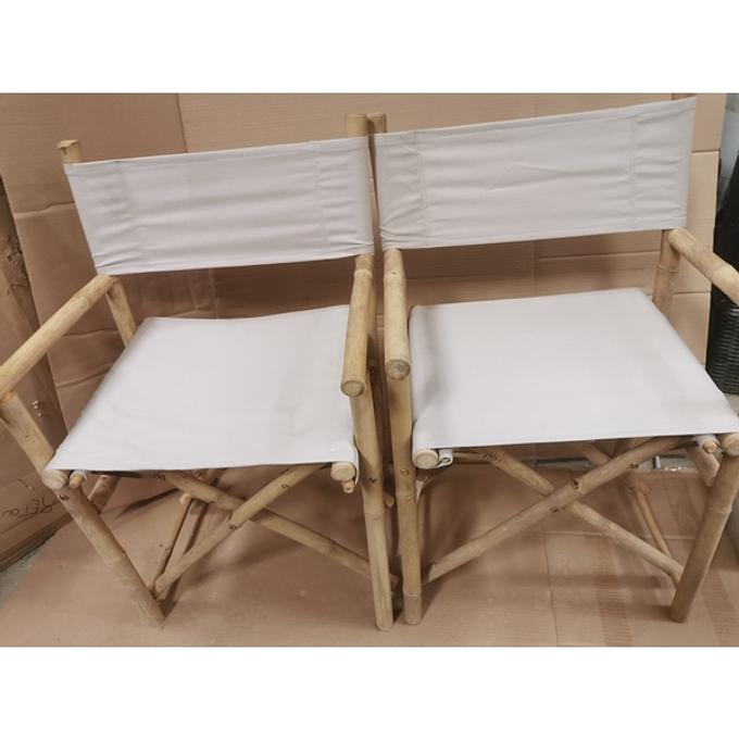 Productbeschrijving: De bamboe regisseursstoel is een goede keuze voor ontspanning in je tuin of op je terras. Deze stoel is gemaakt van stevig bamboe, hij is weerbestendig, sterk en duurzaam. De canvas zitting en rugsteun bieden je zitcomfort. De regisseursstoel kan opgevouwen worden om ruimte te besparen wanneer je de stoel niet nodig hebt. De levering bevat 2 inklapbare stoelen.