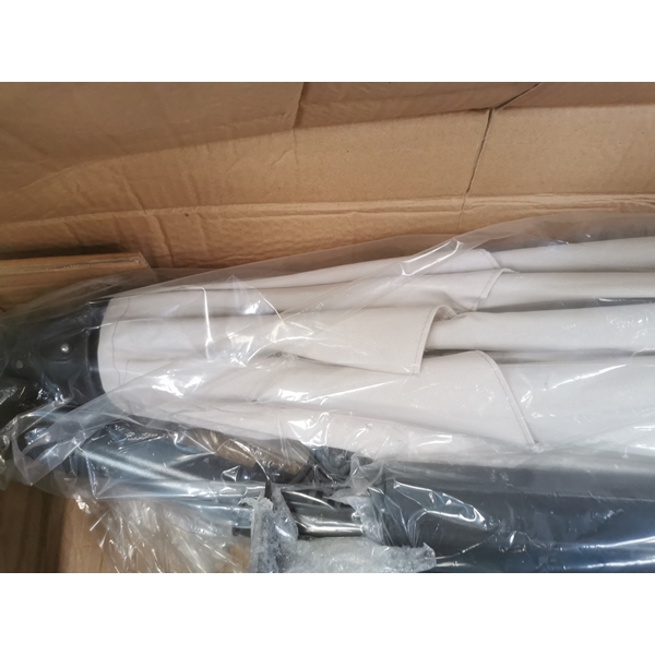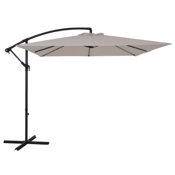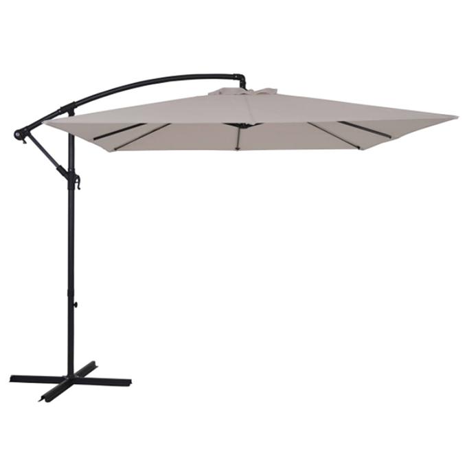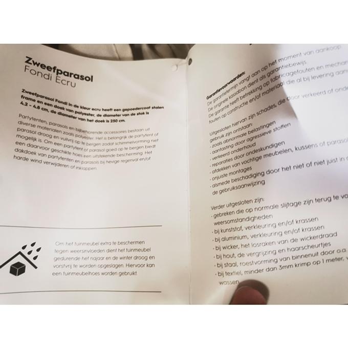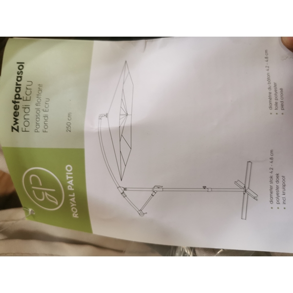 Productbeschrijving: Zweeparasol Fondi in de kleur ecru van het merk Royal Patio is een elegante én functionele parasol die schaduw creëert zonder in de weg te staan. De parasol heeft een gepoedercoat stalen frame met een stokdiameter van 4.2 - 4.8 cm. Het doek is gemaakt van polyester en heeft een diameter van 250 cm. De parasol wordt geleverd inclusief kruispoot die verstevigd dient te worden met siertegels.