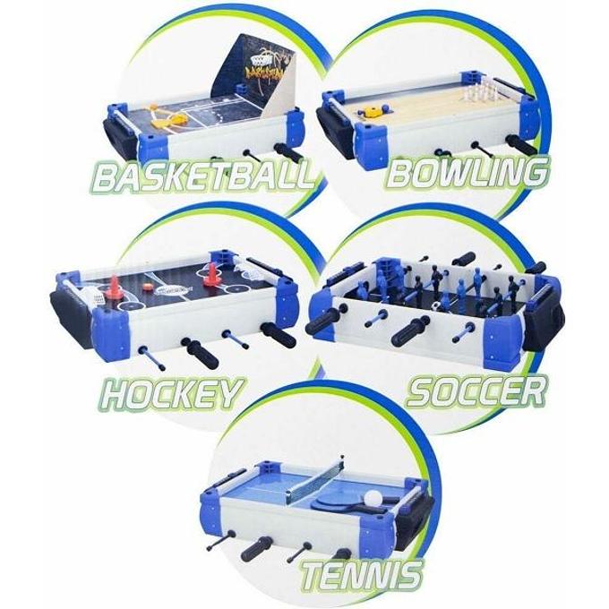 Voorzien van: 1 tafelspel, 1x voetbal, 1x hockey, 1x bowling, 1x basketbal, 1x tafeltennis